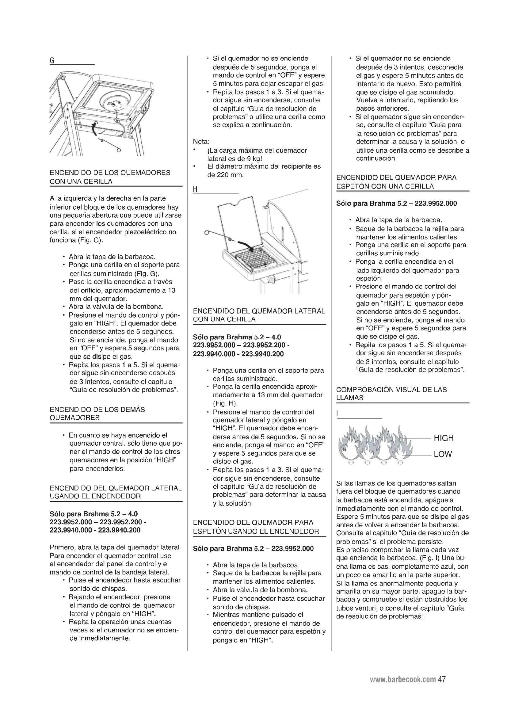 Si las llamas de los quemadores saltan fuera del bloque de quemadores cuando la barbacoa está encendida, apáguela inmediatamente con el mando de control. Espere 5 minutos para que se disipe el gas antes de volver a encender la barbacoa. Consulte el capítulo “Guía de resolución de problemas” si el problema persiste. Es preciso comprobar la llama cada vez que encienda la barbacoa. (Fig. I) Una bu- ena llama es casi completamente azul, con un poco de amarillo en la parte superior. Si la llama es anormalmente pequeña y amarilla en su mayor parte, apague la bar- bacoa y compruebe si están obstruidos los tubos venturi, o consulte el capítulo “Guía de resolución de problemas”. Man_Brahma_5.2_090924_A.indd 47 24/09/09 15:3848 www.barbecook.com
