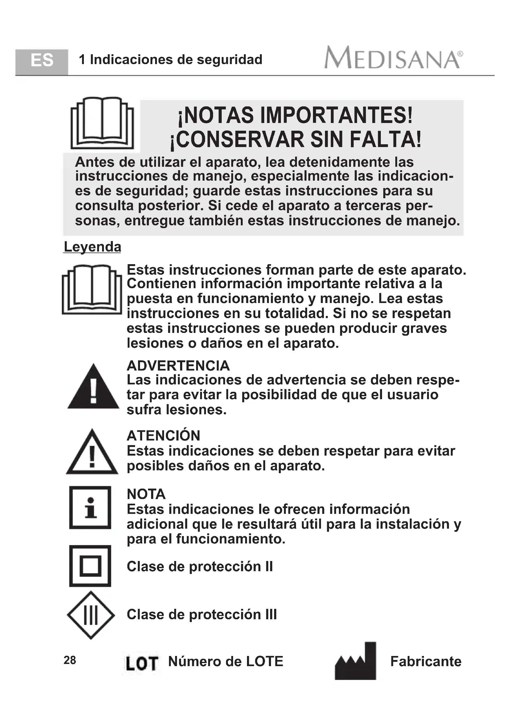 5 Garantie28 Estas instrucciones forman parte de este aparato. Contienen información importante relativa a la puesta en funcionamiento y manejo. Lea estas instrucciones en su totalidad. Si no se respetan estas instrucciones se pueden producir graves lesiones o daños en el aparato. ADVERTENCIA Las indicaciones de advertencia se deben respe- tar para evitar la posibilidad de que el usuario sufra lesiones. ATENCIÓN Estas indicaciones se deben respetar para evitar posibles daños en el aparato. NOTA Estas indicaciones le ofrecen información adicional que le resultará útil para la instalación y para el funcionamiento. Clase de protección III Leyenda Número de LOTE Fabricante ¡NOTAS IMPORTANTES! ¡CONSERVAR SIN FALTA! Antes de utilizar el aparato, lea detenidamente las instrucciones de manejo, especialmente las indicacion- es de seguridad; guarde estas instrucciones para su consulta posterior. Si cede el aparato a terceras per- sonas, entregue también estas instrucciones de manejo.