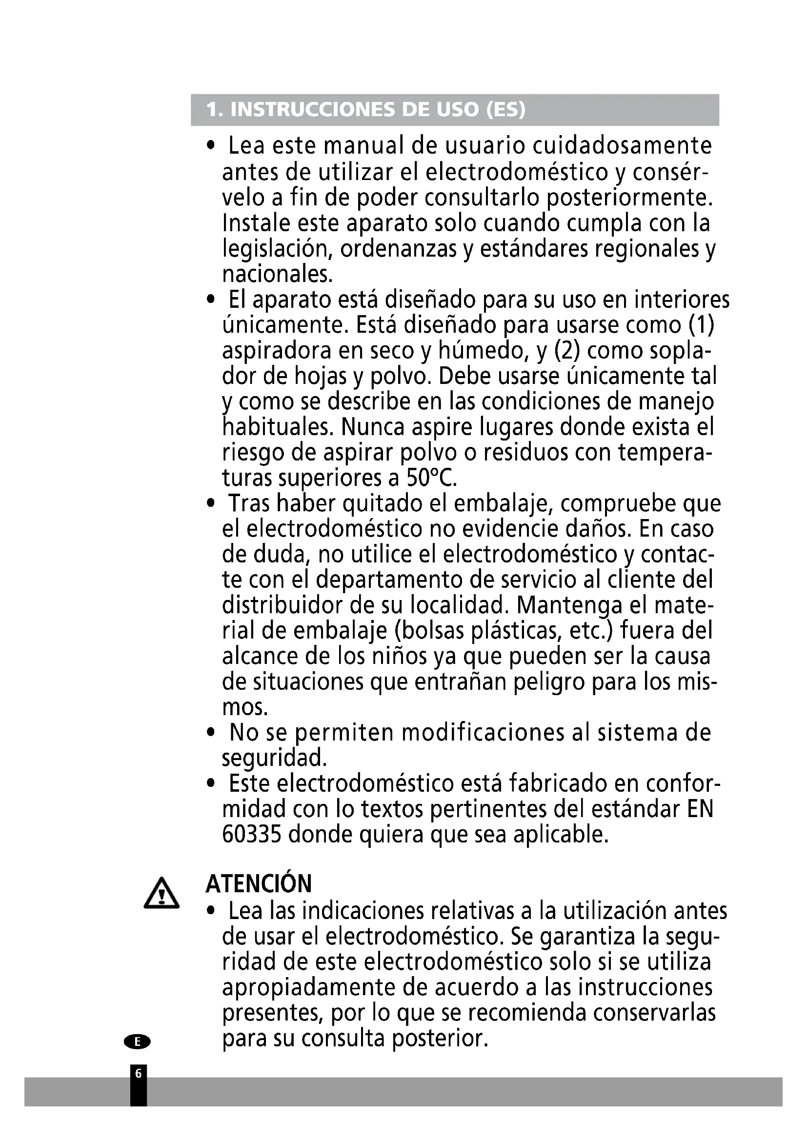 - Este electrodoméstico está fabricado en confor- midad con lo textos pertinentes del estándar EN 60335 donde quiera que sea aplicable. ATENCIÓN