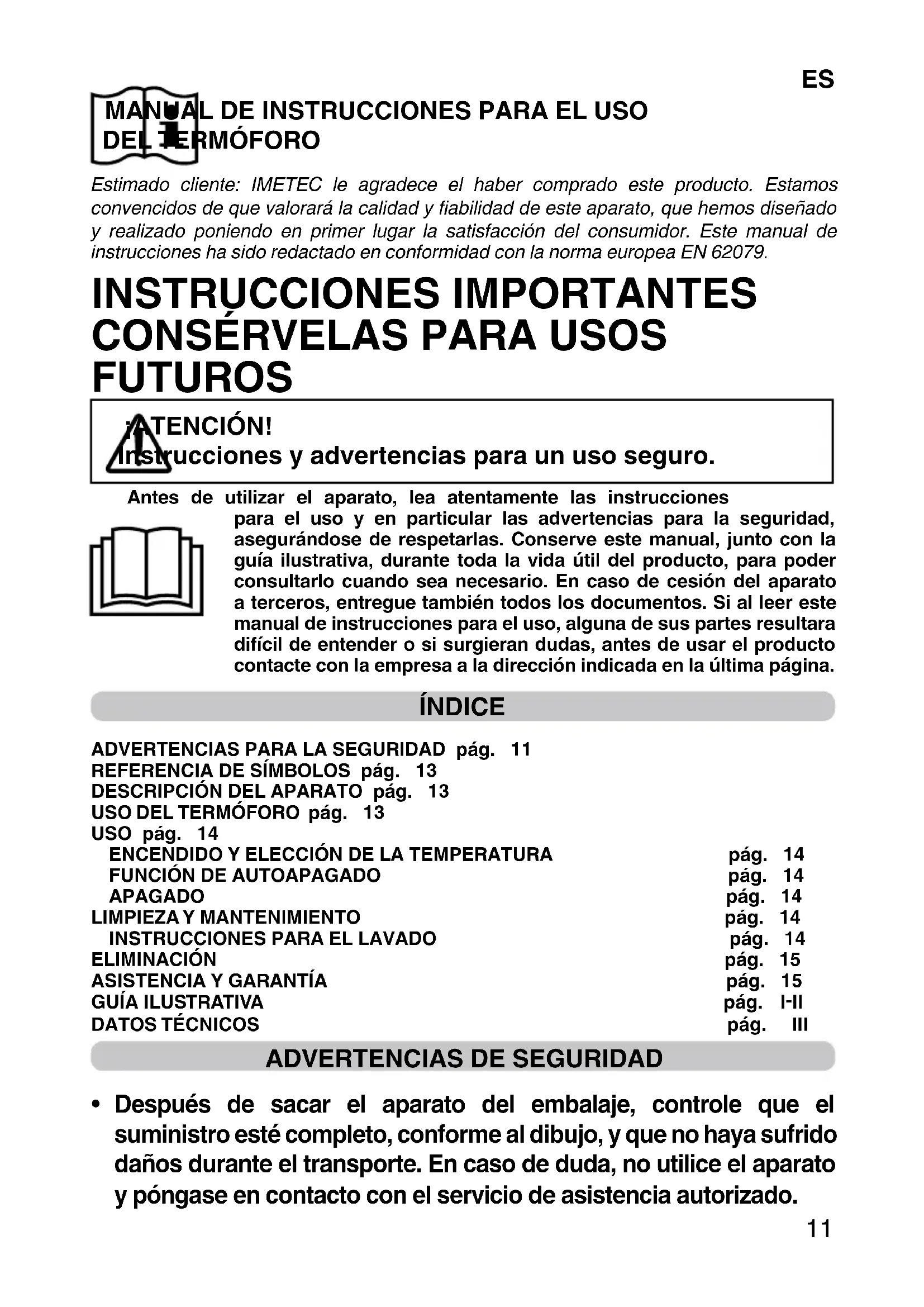 Estimado cliente: IMETEC le agradece el haber comprado este producto. Estamos convencidos de que valorará la calidad y fiabilidad de este aparato, que hemos diseñado y realizado poniendo en primer lugar la satisfacción del consumidor. Este manual de instrucciones ha sido redactado en conformidad con la norma europea EN 62079. INSTRUCCIONES IMPORTANTES