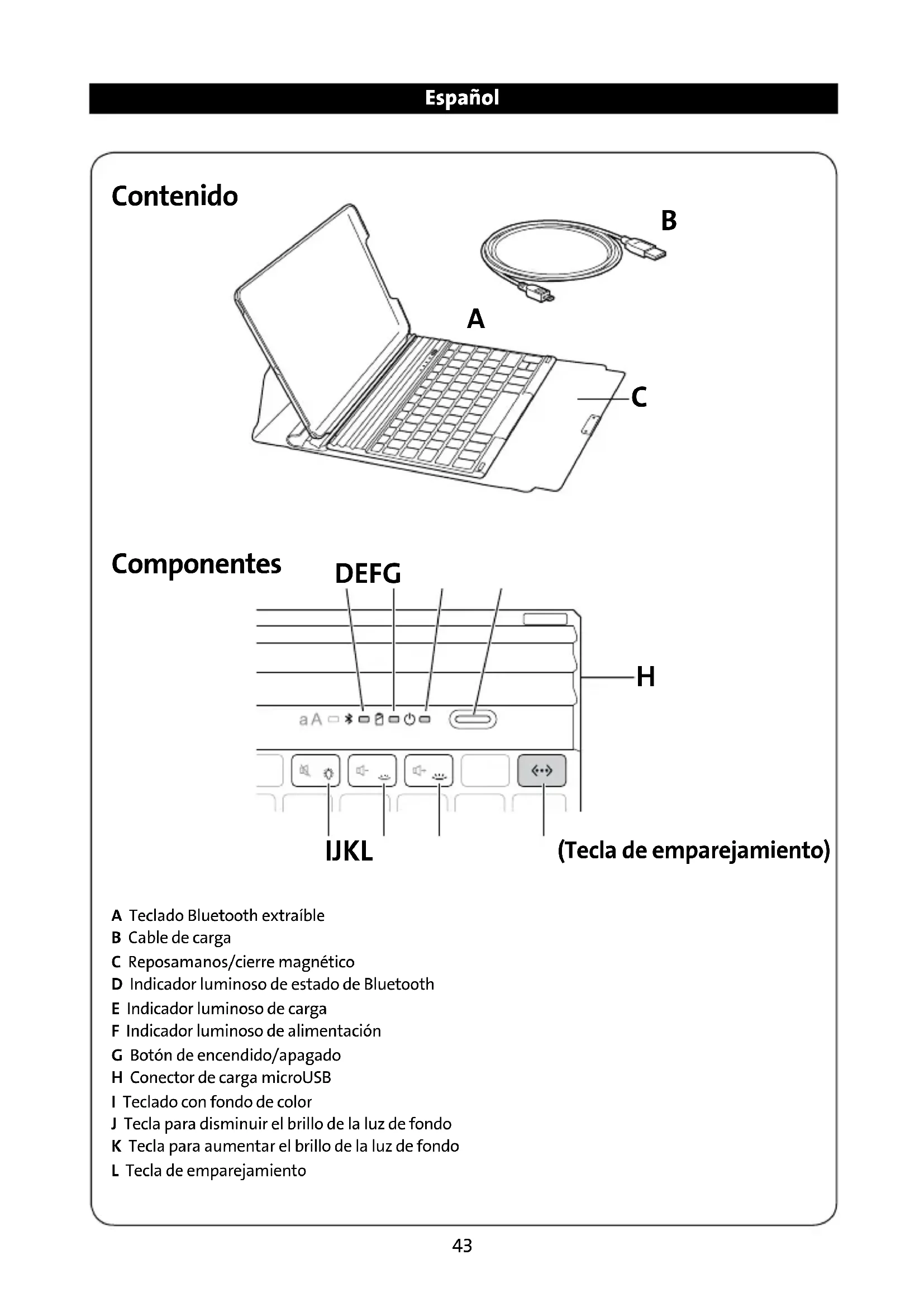 Key Folio contiene una bateria de polímeros de litio que es inflamable. Manténgalo alejado de las llamas. - Paraatar el riesgo de cortocircuito uotros riesgos potenciales, no permita que objectos metalicos, como monidas ollaves,entar en contacto con KeyFolio, y no inserte objetos extraños en KeyFolio y sus puertos.