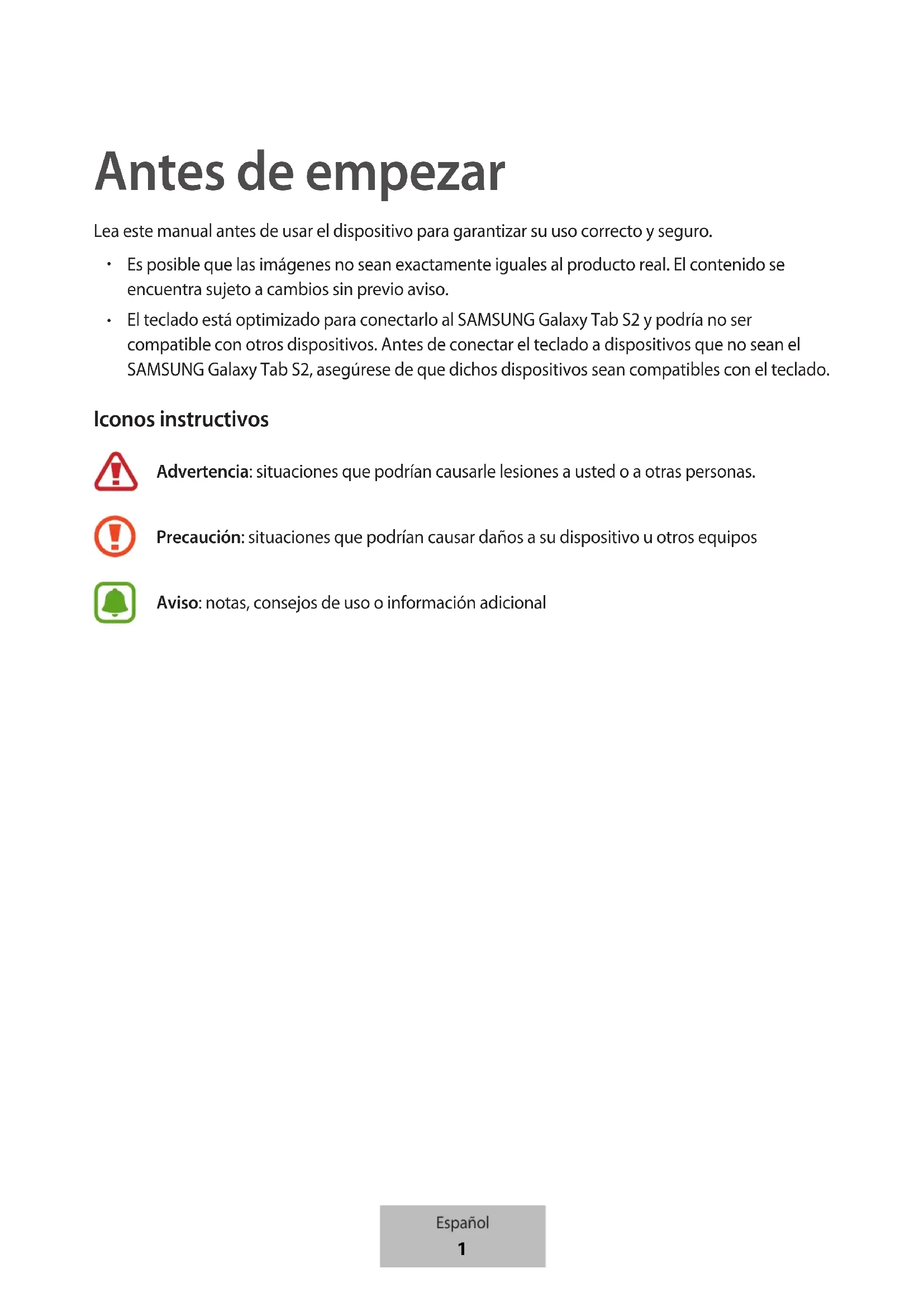 El teclado está optimizado para conectarlo al SAMSUNG Galaxy Tab S2 y podría no ser compatible con otros dispositivos. Antes de conectar el teclado a dispositivos que no sean el SAMSUNG Galaxy Tab S2, asegúrese de que dichos dispositivos sean compatibles con el teclado. Iconos instructivos Advertencia: situaciones que podrían causarle lesiones a usted o a otras personas. Precaución: situaciones que podrían causar daños a su dispositivo u otros equipos Aviso: notas, consejos de uso o información adicional Español