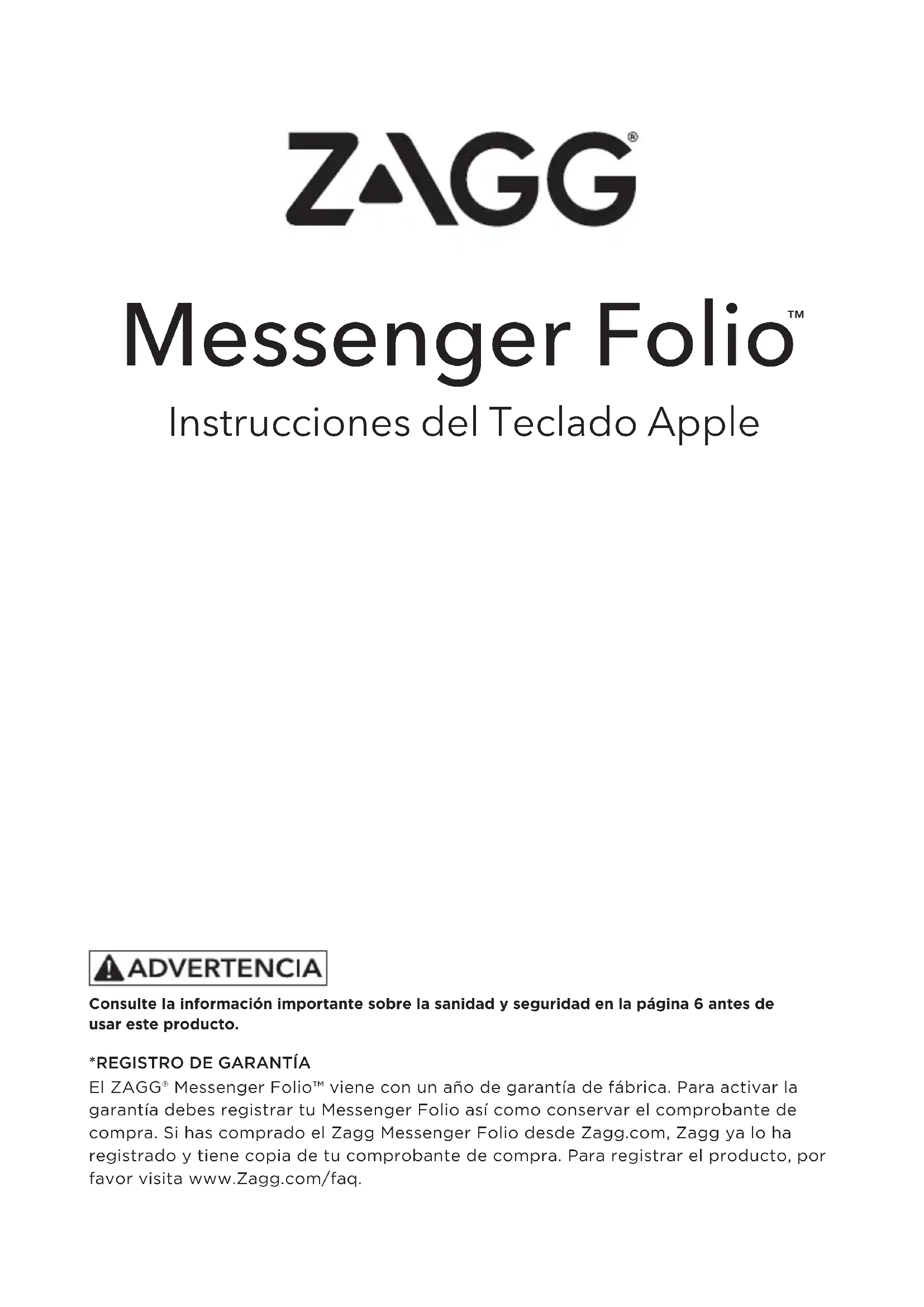 El ZAGG® Messenger Folio™ viene con un año de garantía de fábrica. Para activar la garantía debes registrar tu Messenger Folio así como conservar el comprobante de compra. Si has comprado el Zagg Messenger Folio desde Zagg.com, Zagg ya lo ha registrado y tiene copia de tu comprobante de compra. Para registrar el producto, por favor visita www.Zagg.com/faq. Consulte la información importante sobre la sanidad y seguridad en la página 6 antes de usar este producto. Instrucciones del Teclado Apple1