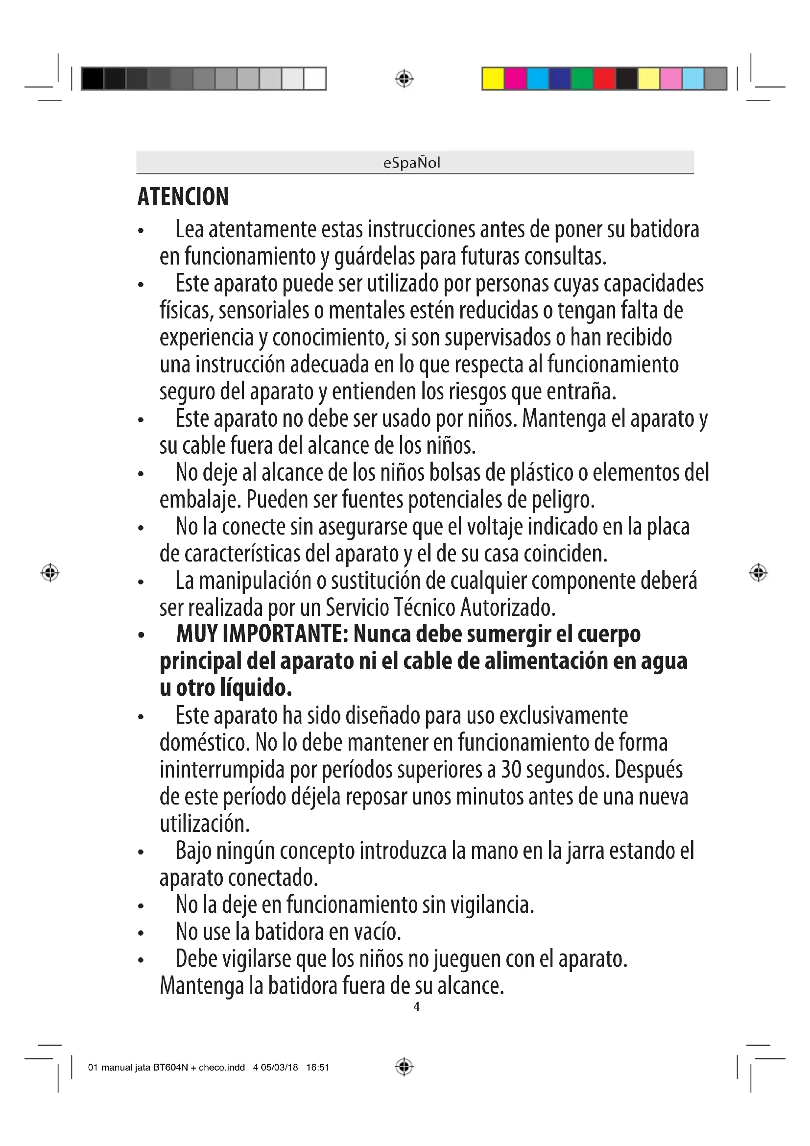 DATOS TÉCNICOS • DADOS TECNICOS • TECHNICAL DATA Marzo 2018 Mod. BT604N 220/240 V~ 50/60 Hz 1.000 W Los textos, fotos, colores, figuras y datos corresponden al nivel técnico del momento en que se han impreso. Nos reservamos el derecho a modificaciones, motivadas por el desarrollo permanente de la técnica en nuestros productos. 01 manual jata BT604N + checo.indd 2 05/03/18 16:513 COMPONENTES PRINCIPALES
