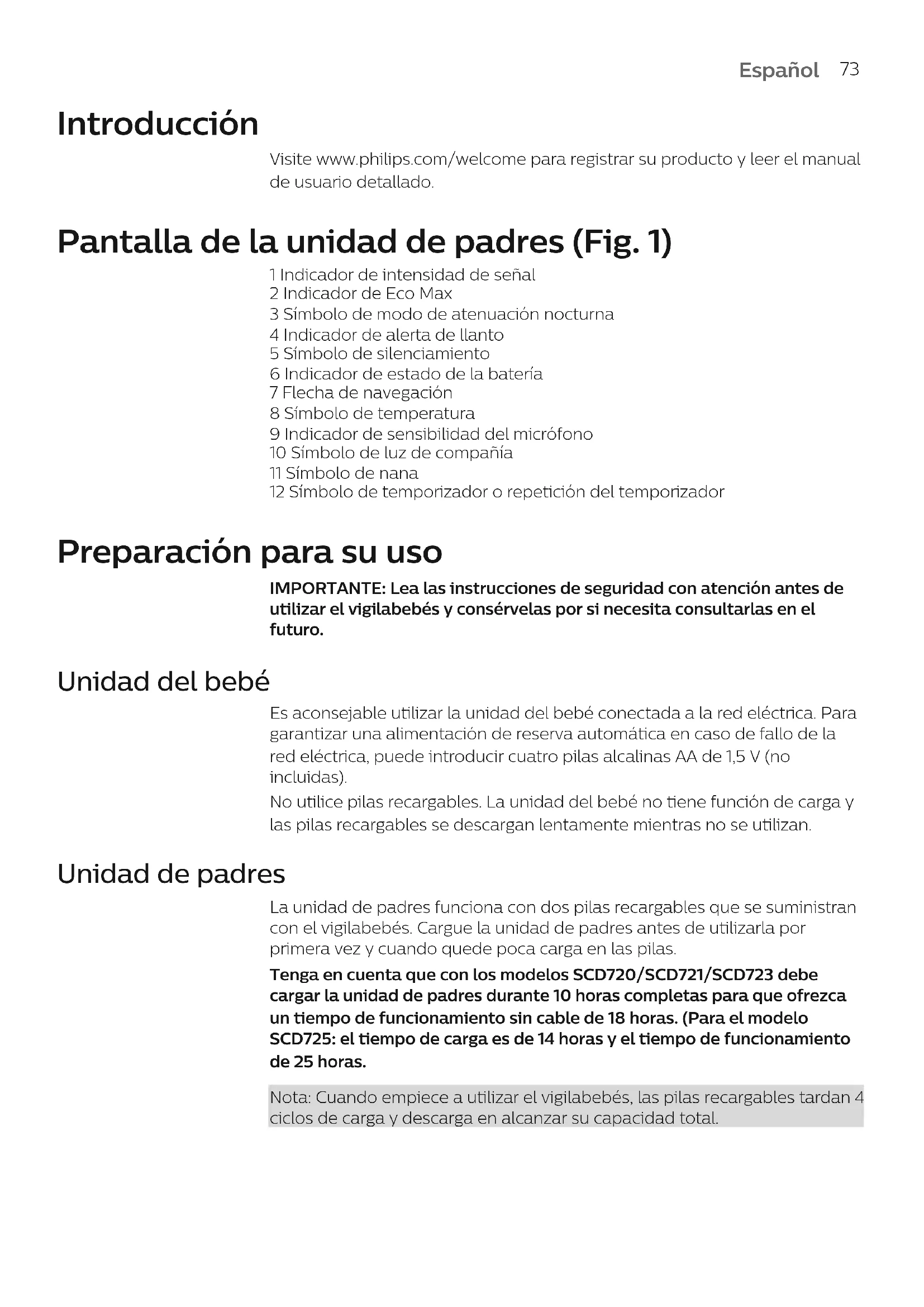 Tenga en cuenta que con los modelos SCD720/SCD721/SCD723 deben carregar launidad de padres durante 10 horas completas para que ofrezca un tiempo de funcionaimiento sin cable de 18 horas. (Para el modelo SCD725: el tiempo de entrega es de 14 horas y el tiempo de funcionaimiento de 25 horas.