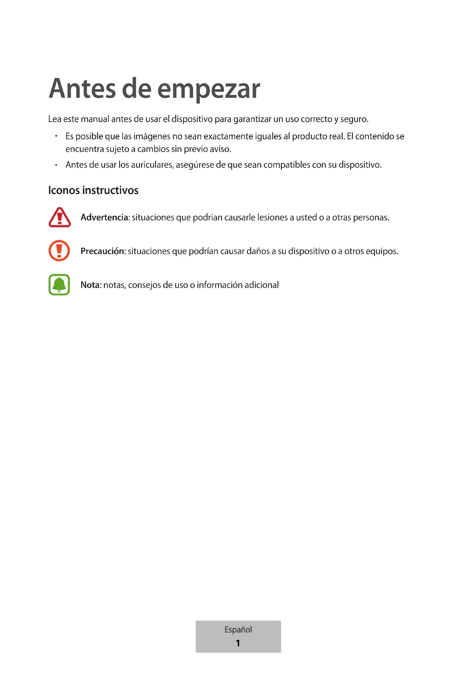 Antes de usar los auriculares, asegúrese de que sean compatibles con su dispositivo. Iconos instructivos Advertencia: situaciones que podrían causarle lesiones a usted o a otras personas. Precaución: situaciones que podrían causar daños a su dispositivo o a otros equipos. Nota: notas, consejos de uso o información adicional Español