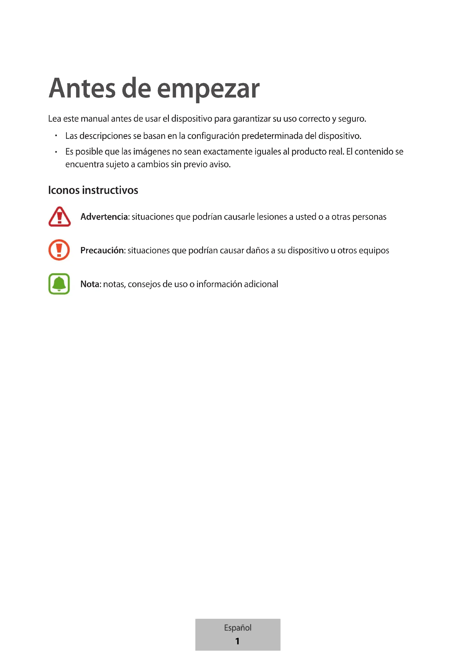 Es posible que las imágenes no sean exactamente iguales al producto real. El contenido está sujeto a cambio sin previo aviso. Iconos instructivos Advertencia: Situaciones que pueden provocarle lesiones a usted o a otras personas Precaución: Situaciones que pueden provocarle daños al dispositivo o a otros equipos Nota: Notas, sugerencias de uso o información adicional Español(Castellano)