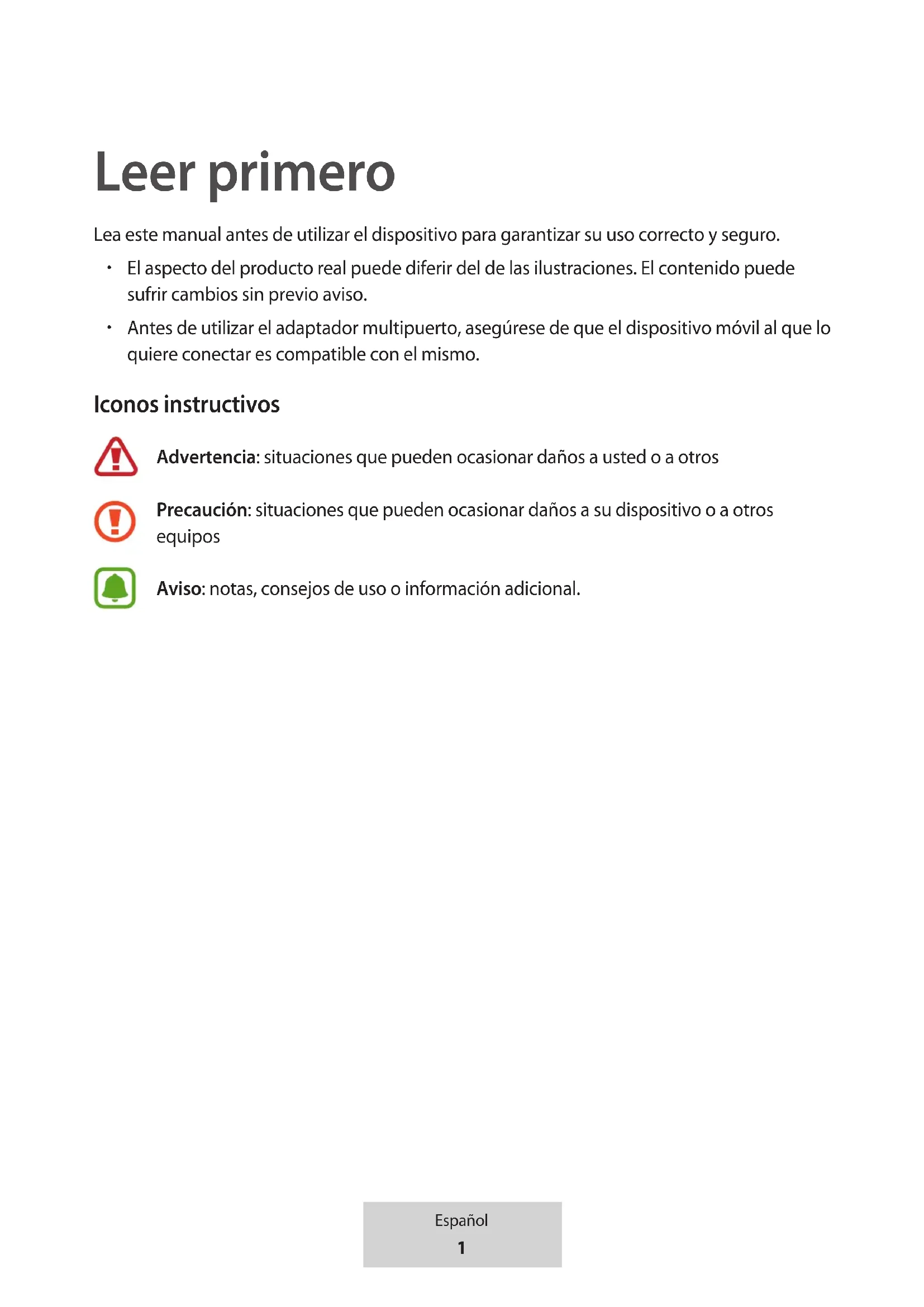 Antes de utilizar el adaptador multipuerto, asegúrese de que el dispositivo móvil al que lo quiere conectar es compatible con el mismo. Iconos instructivos Advertencia: situaciones que pueden ocasionar daños a usted o a otros Precaución: situaciones que pueden ocasionar daños a su dispositivo o a otros equipos Aviso: notas, consejos de uso o información adicional. Español2 Español Información preliminar Contenido del paquete Compruebe que los siguientes artículos estén incluidos en la caja: