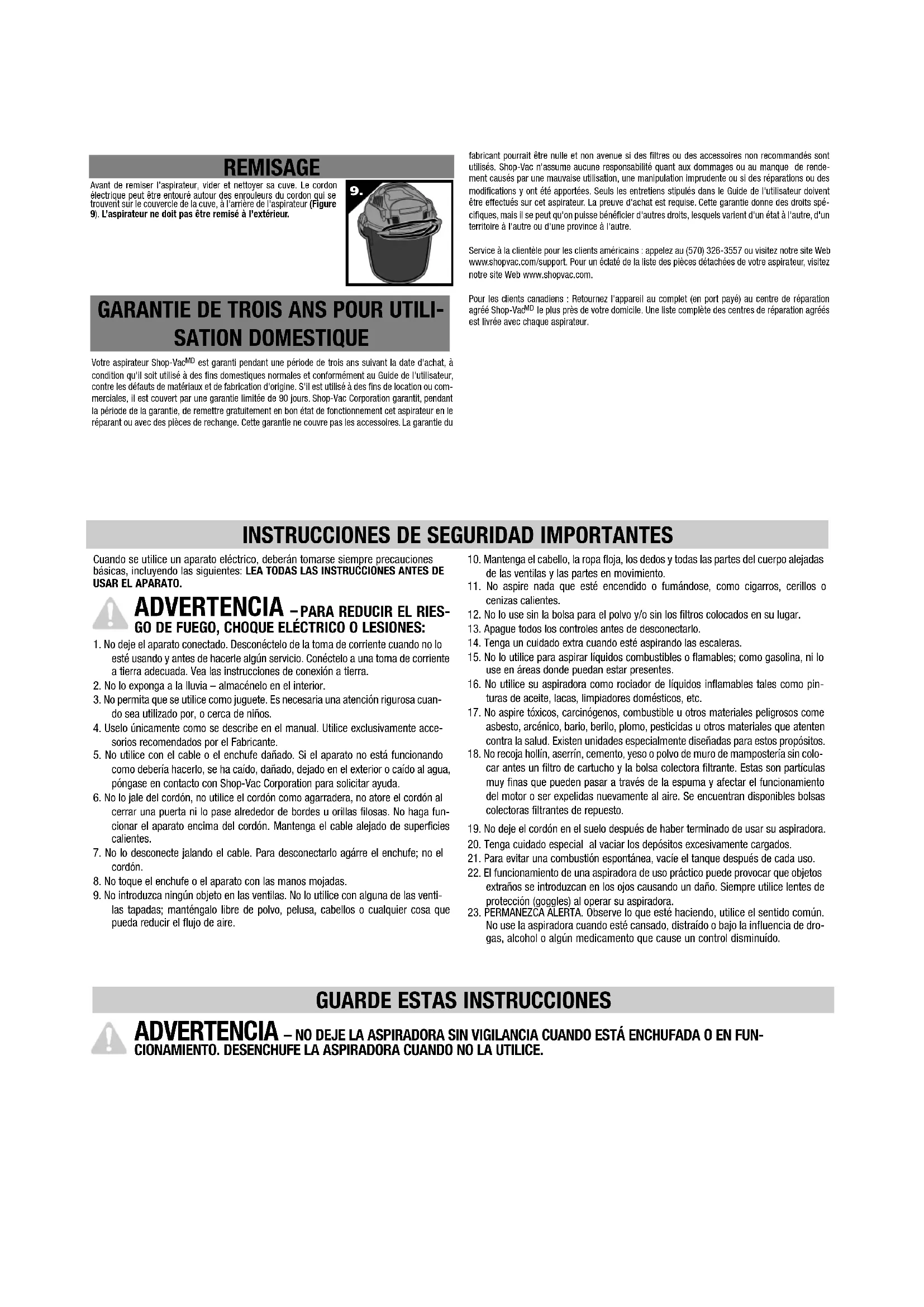 está garantizada para uso doméstico normal, de acuerdo con el Manual del Usuario, contra defectos originales en los materiales y en la mano de obra por un período de tres años desde la fecha de compra. Si este producto se utilizara para fines com- erciales o de alquiler, se aplicará una garantía limitada de 90 días. Shop-Vac Corporation garantiza la puesta de esta aspiradora en condiciones operativas correctas, ya sea mediante su reparación o el reemplazo de sus piezas, durante el período de garantía, y sin cargo alguno. Esta garantía no cubre los accesorios. La utilización de filtros y/o accesorios no recomendados puede anular la garantía del fabricante. Shop-Vac