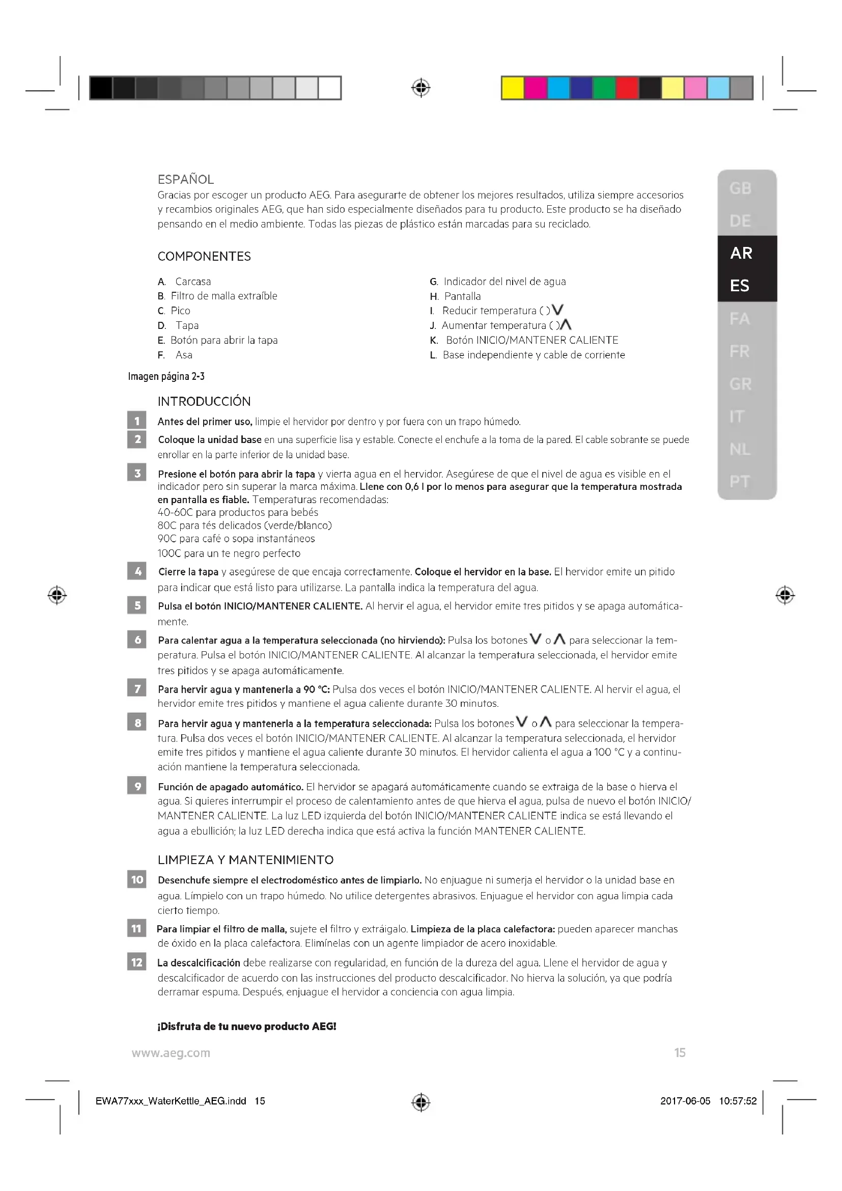 10 Desenchufe siempre el electrodoméstico antes de limpiarlo. No enjuague ni sumerja el hervidor o la unidad base en agua. Límpielo con un trapo húmedo. No utilice detergentes abrasivos. Enjuague el hervidor con agua limpia cada cierto tiempo. 11 Para limpiar el ltro de malla, sujete el ltro y extráigalo. Limpieza de la placa calefactora: pueden aparecer manchas de óxido en la placa calefactora. Elimínelas con un agente limpiador de acero inoxidable. 12 La descalcicación debe realizarse con regularidad, en función de la dureza del agua. Llene el hervidor de agua y descalcicador de acuerdo con las instrucciones del producto descalcicador. No hierva la solución, ya que podría derramar espuma. Después, enjuague el hervidor a conciencia con agua limpia. ¡Disfruta de tu nuevo producto AEG! EWA77xxx_WaterKettle_AEG.indd 15 2017-06-05 10:57:5216 www.aeg.com