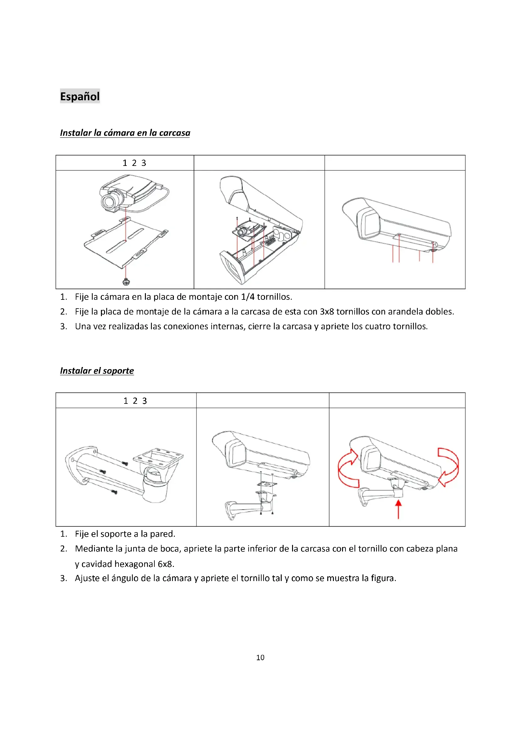 2. Fije la placa de montaje de la cámara a la carcasa de esta con 3x8 tornillos con arandela dobles.