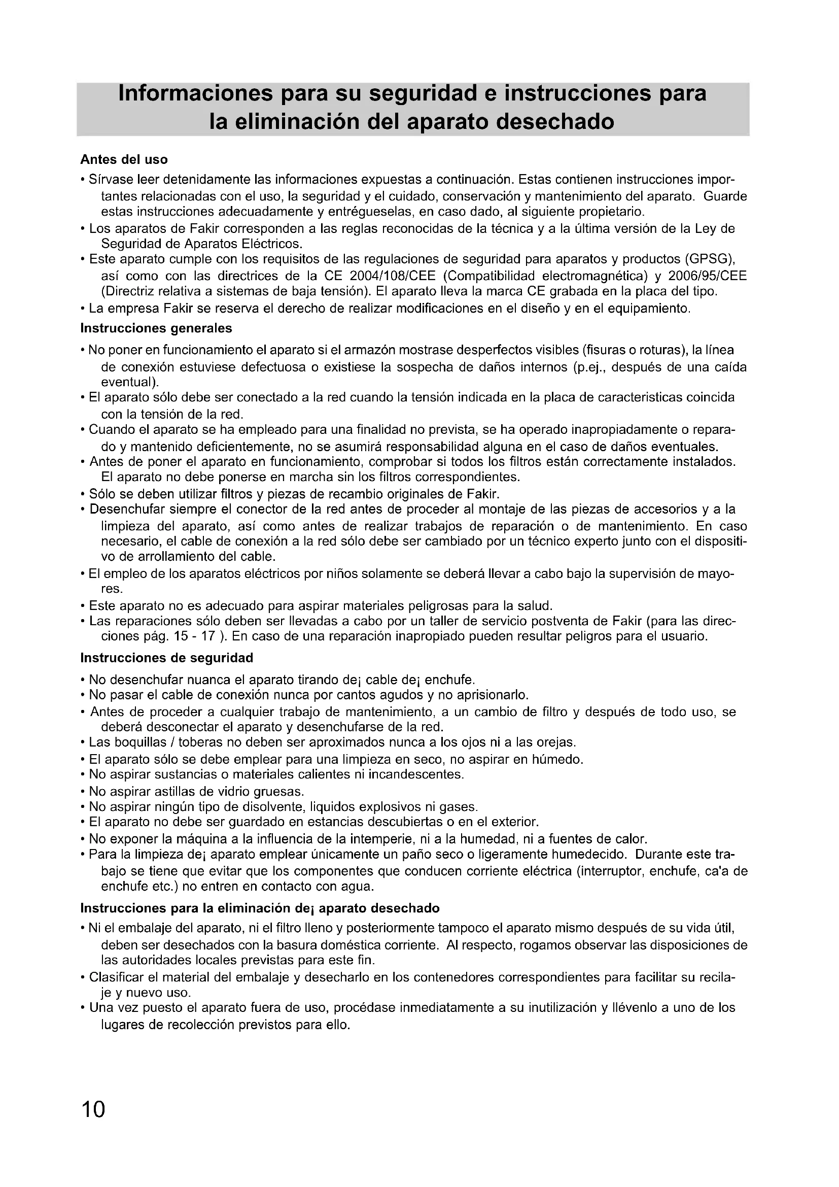 - Las reparaciones sólo deben ser llevadas a cabo por un taller de servicio postventa de Fakir (para las direc- ciones pág. 15 - 17 ). En caso de una reparación inapropiado pueden resultar peligros para el usuario. Instrucciones de seguridad