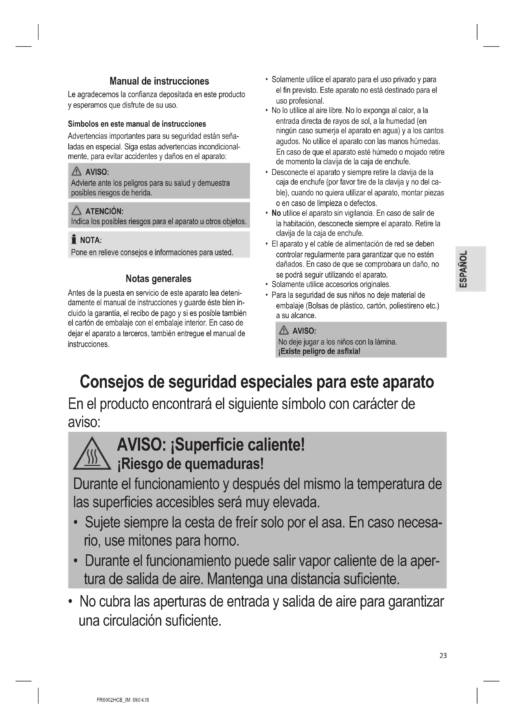 - Este aparato no está destinado para ser sumergido en agua du- rante su limpieza. Siga las instrucciones que hemos incluido en el capítulo “Limpieza”.FR6002HCB_IM 09.0 4.18