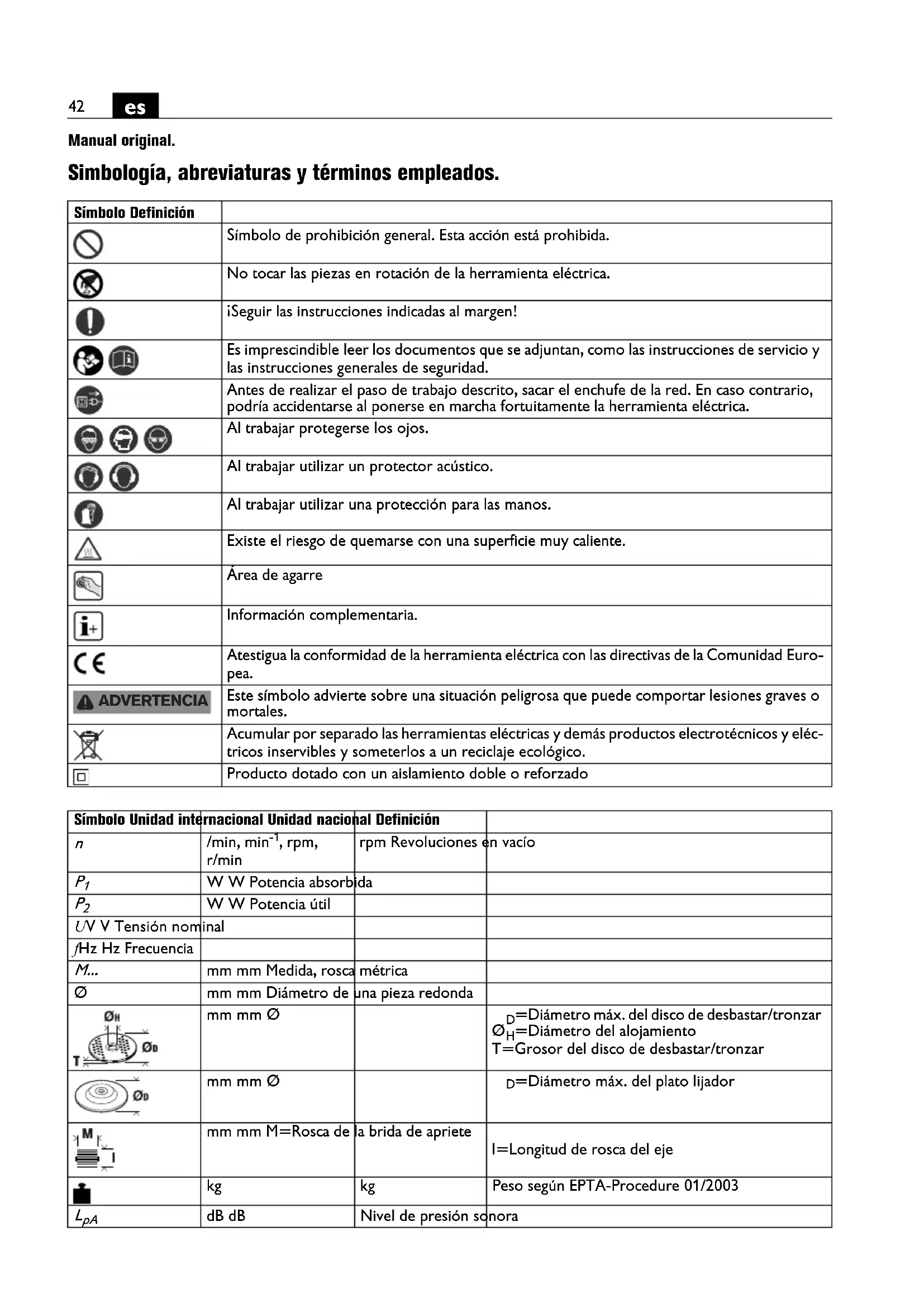 Manual original. Simbología, abreviaturas y términos empleados. Símbolo Definición Símbolo de prohibición general. Esta acción está prohibida. No tocar las piezas en rotación de la herramienta eléctrica. ¡Seguir las instrucciones indicadas al margen! Es imprescindible leer los documentos que se adjuntan, como las instrucciones de servicio y las instrucciones generales de seguridad. Antes de realizar el paso de trabajo descrito, sacar el enchufe de la red. En caso contrario, podría accidentarse al ponerse en marcha fortuitamente la herramienta eléctrica. Al trabajar protegerse los ojos. Al trabajar utilizar un protector acústico. Al trabajar utilizar una protección para las manos. Existe el riesgo de quemarse con una superficie muy caliente. Área de agarre Información complementaria. Atestigua la conformidad de la herramienta eléctrica con las directivas de la Comunidad Euro- pea. Este símbolo advierte sobre una situación peligrosa que puede comportar lesiones graves o mortales. Acumular por separado las herramientas eléctricas y demás productos electrotécnicos y eléc- tricos inservibles y someterlos a un reciclaje ecológico. Producto dotado con un aislamiento doble o reforzado ADVERTENCIA Símbolo Unidad internacional Unidad nacional Definición