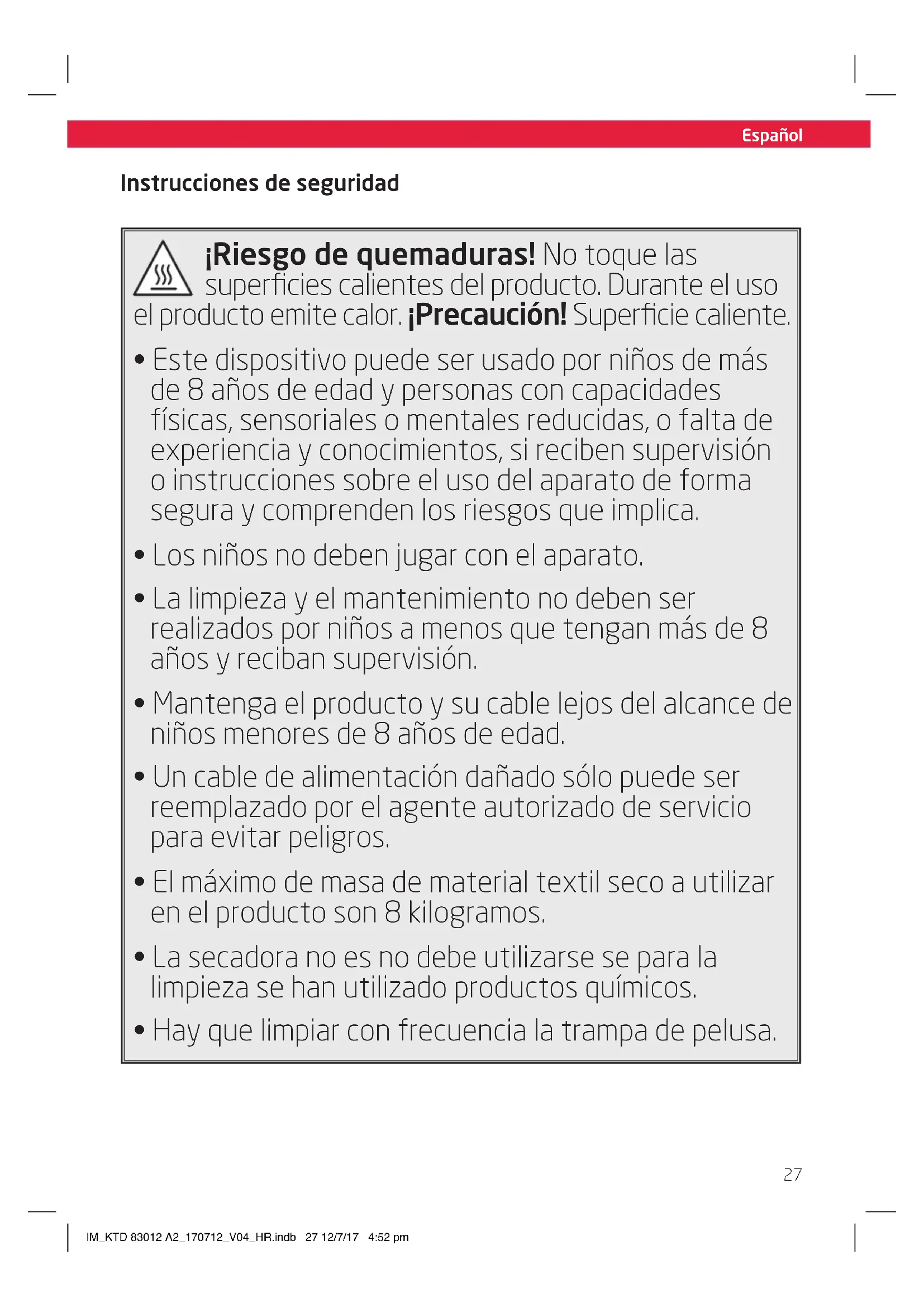 - Hay que limpiar con frecuencia la trampa de pelusa. IM_KTD 83012 A2_170712_V04_HR.indb 27 12/7/17 4:52 pmEspañol