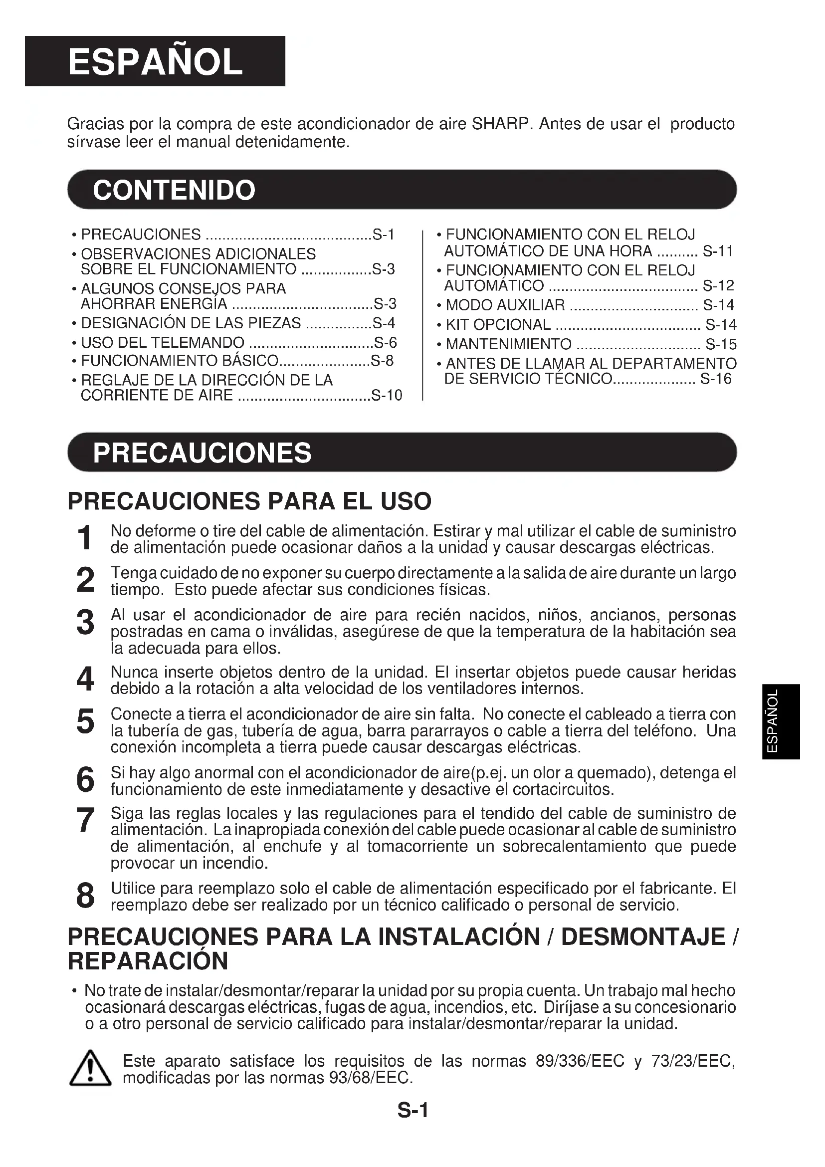 - No trate de instalar/desmontar/reparar la unidad por su propia cuenta. Un trabajo mal hecho ocasionará descargas eléctricas, fugas de agua, incendios, etc. Diríjase a su concesionarioo a otro personal de servicio calificado para instalar/desmontar/reparar la unidad.Este aparato satisface los requisitos de las normas 89/336/EEC y 73/23/EEC,modificadas por las normas 93/68/EEC. ESPAÑOL PRECAUCIONESPRECAUCIONES