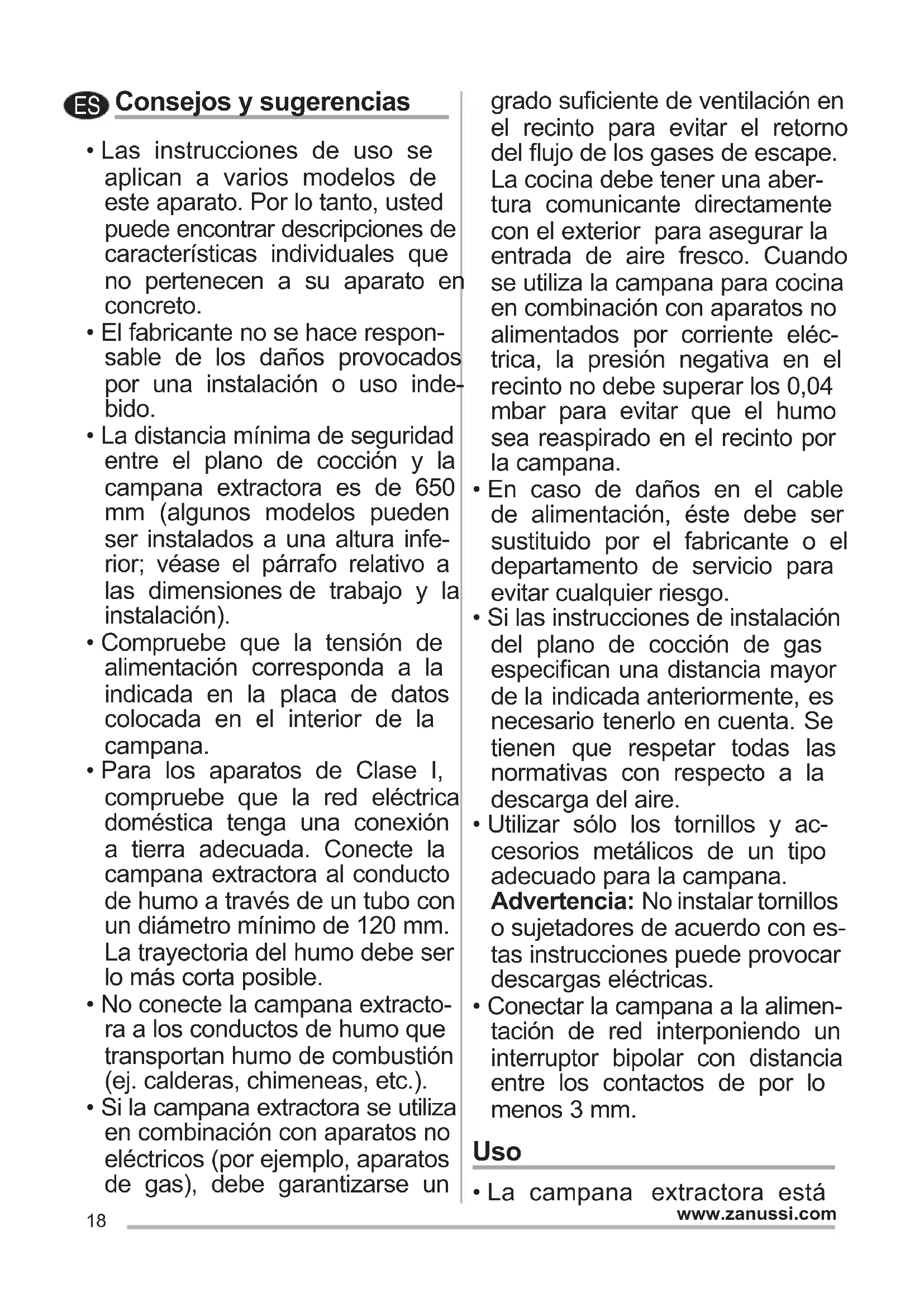 - La campana extractora está ES19 www.zanussi.com diseñada exclusivamente para uso doméstico, para eliminar los olores de la cocina.