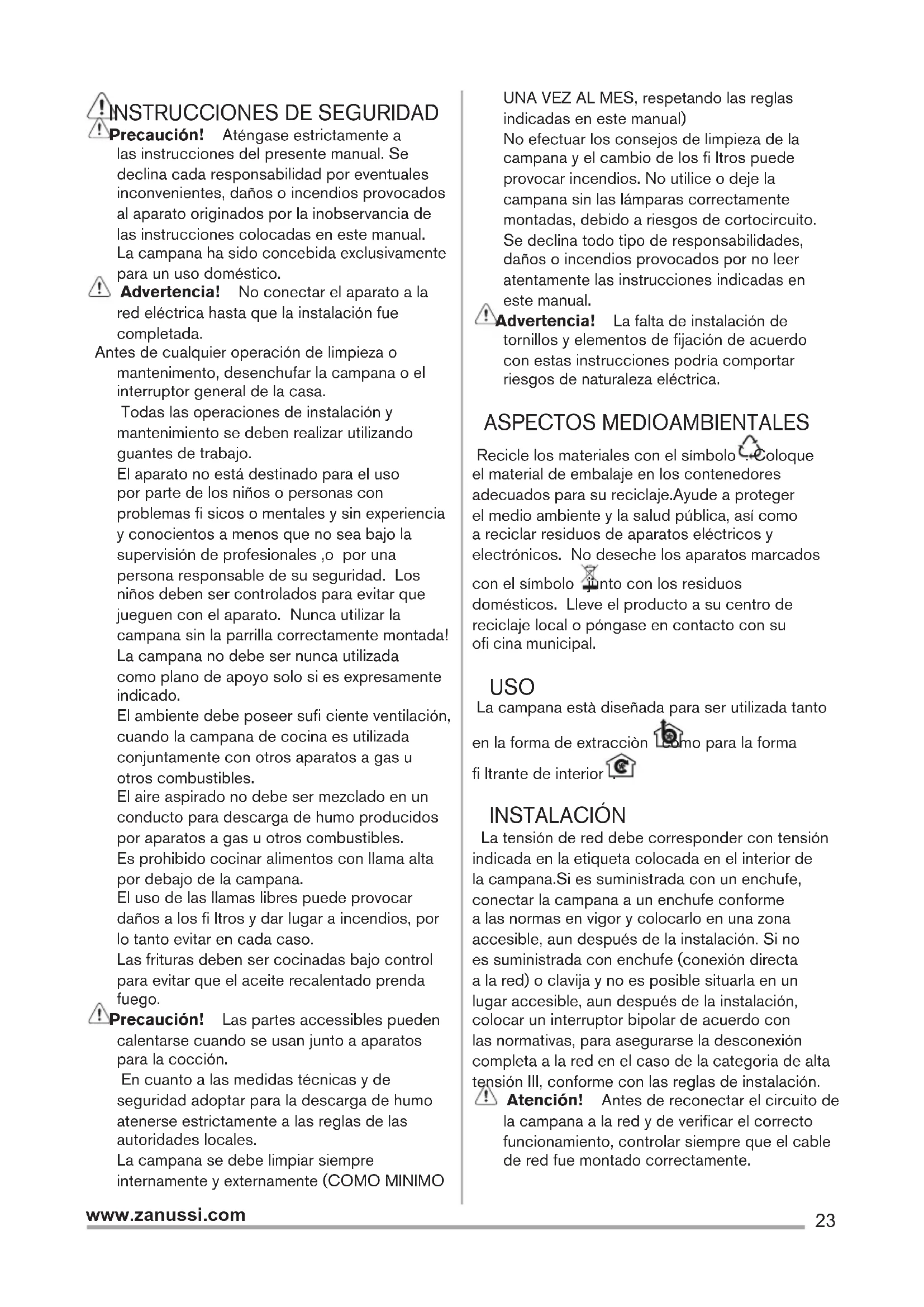 Precaución! Aténgase estrictamente a las instrucciones del presente manual. Se declina cada responsabilidad por eventuales inconvenientes, daños o incendios provocados al aparato originados por la inobservancia de las instrucciones colocadas en este manual. La campana ha sido concebida exclusivamente para un uso doméstico. Advertencia! No conectar el aparato a la red eléctrica hasta que la instalación fue completada. Antes de cualquier operación de limpieza o mantenimento, desenchufar la campana o el interruptor general de la casa. Todas las operaciones de instalación y mantenimiento se deben realizar utilizando guantes de trabajo. El aparato no está destinado para el uso por parte de los niños o personas con problemas fi sicos o mentales y sin experiencia y conocientos a menos que no sea bajo la supervisión de profesionales ,o por una persona responsable de su seguridad. Los niños deben ser controlados para evitar que jueguen con el aparato. Nunca utilizar la campana sin la parrilla correctamente montada! La campana no debe ser nunca utilizada como plano de apoyo solo si es expresamente indicado. El ambiente debe poseer sufi ciente ventilación, cuando la campana de cocina es utilizada conjuntamente con otros aparatos a gas u otros combustibles. El aire aspirado no debe ser mezclado en un conducto para descarga de humo producidos por aparatos a gas u otros combustibles. Es prohibido cocinar alimentos con llama alta por debajo de la campana. El uso de las llamas libres puede provocar daños a los fi ltros y dar lugar a incendios, por lo tanto evitar en cada caso. Las frituras deben ser cocinadas bajo control para evitar que el aceite recalentado prenda fuego. Precaución! Las partes accessibles pueden calentarse cuando se usan junto a aparatos para la cocción. En cuanto a las medidas técnicas y de seguridad adoptar para la descarga de humo atenerse estrictamente a las reglas de las autoridades locales. La campana se debe limpiar siempre internamente y externamente (COMO MINIMO UNA VEZ AL MES, respetando las reglas indicadas en este manual) No efectuar los consejos de limpieza de la campana y el cambio de los fi ltros puede provocar incendios. No utilice o deje la campana sin las lámparas correctamente montadas, debido a riesgos de cortocircuito. Se declina todo tipo de responsabilidades, daños o incendios provocados por no leer atentamente las instrucciones indicadas en este manual. Advertencia! La falta de instalación de tornillos y elementos de fijación de acuerdo con estas instrucciones podría comportar riesgos de naturaleza eléctrica. ASPECTOS MEDIOAMBIENTALES Recicle los materiales con el símbolo . Coloque el material de embalaje en los contenedores adecuados para su reciclaje.Ayude a proteger el medio ambiente y la salud pública, así como a reciclar residuos de aparatos eléctricos y electrónicos. No deseche los aparatos marcados con el símbolo junto con los residuos domésticos. Lleve el producto a su centro de reciclaje local o póngase en contacto con su ofi cina municipal. USO La campana està diseñada para ser utilizada tanto en la forma de extracciòn como para la forma fi ltrante de interior . INSTALACIÓN La tensión de red debe corresponder con tensión indicada en la etiqueta colocada en el interior de la campana.Si es suministrada con un enchufe, conectar la campana a un enchufe conforme a las normas en vigor y colocarlo en una zona accesible, aun después de la instalación. Si no es suministrada con enchufe (conexión directa a la red) o clavija y no es posible situarla en un lugar accesible, aun después de la instalación, colocar un interruptor bipolar de acuerdo con las normativas, para asegurarse la desconexión completa a la red en el caso de la categoria de alta tensión III, conforme con las reglas de instalación. Atención! Antes de reconectar el circuito de la campana a la red y de verificar el correcto funcionamiento, controlar siempre que el cable de red fue montado correctamente.24 www.zanussi.com La distancia mínima entre la superfi cie de cocción y la parte más baja de la campana no debe ser inferior a 50cm en el caso de cocinas electricas y de 65cm en el caso de cocinas a gas o mixtas. Si las instrucciones para la instalación del dispositivo para cocinar con gas especifi can una distancia mayor, hay que tenerlo en consideración. MANTENIMIENTO ¡Atención! Antes de cualquier operación de limpieza o mantenimiento, retire la campana de la red eléctrica desconectando el enchufe o desconectando el interruptor general de la casa. La campana debe ser limpiada con frecuencia tanto externamente como internamente (con la misma frecuencia con la que se realiza el mantenimiento de los fi ltros de grasa). Para la limpieza, utilice un paño impregnado de detergente líquido neutro. No utilice productos que contengan abrasivos. ¡NO UTILICE ALCOHOL! ¡Atención! De no observarse las instrucciones dadas para limpiar el aparato y sustituir el filtro, puede producirse un incendio. El fabricante recomienda leerlas y respetarlas atentamente. El fabricante no se hace responsable por los daños al motor o los incendios provocados en el aparato debido a intervenciones de mantenimiento incorrectas o al incumplimiento de las normas de seguridad proporcionadas. Filtro antigrasa - El fi ltro antigrasa debe limpiarse una vez al mes con detergentes no agresivos, manualmente o bien en lavavajillas a bajas temperaturas y con ciclo breve. Con el lavado en el lavavajilla el fi ltro antigrasa metálico puede desteñirse pero sus características de fi ltrado no cambian absolutamente. Filtro al carbón activo - Type 20 LONG LIFE - Filtro al carbón activo lavable El fi ltro al carbón puede lavarse cada dos meses con agua caliente y detergentes adecuados o en lavavajillas a 65°C ( en caso de lavado con lavavajillas, realice el ciclo de lavado completo sin platos en el interior.). Quite el agua que haya quedado en el fi ltro sin estropearlo, después qui