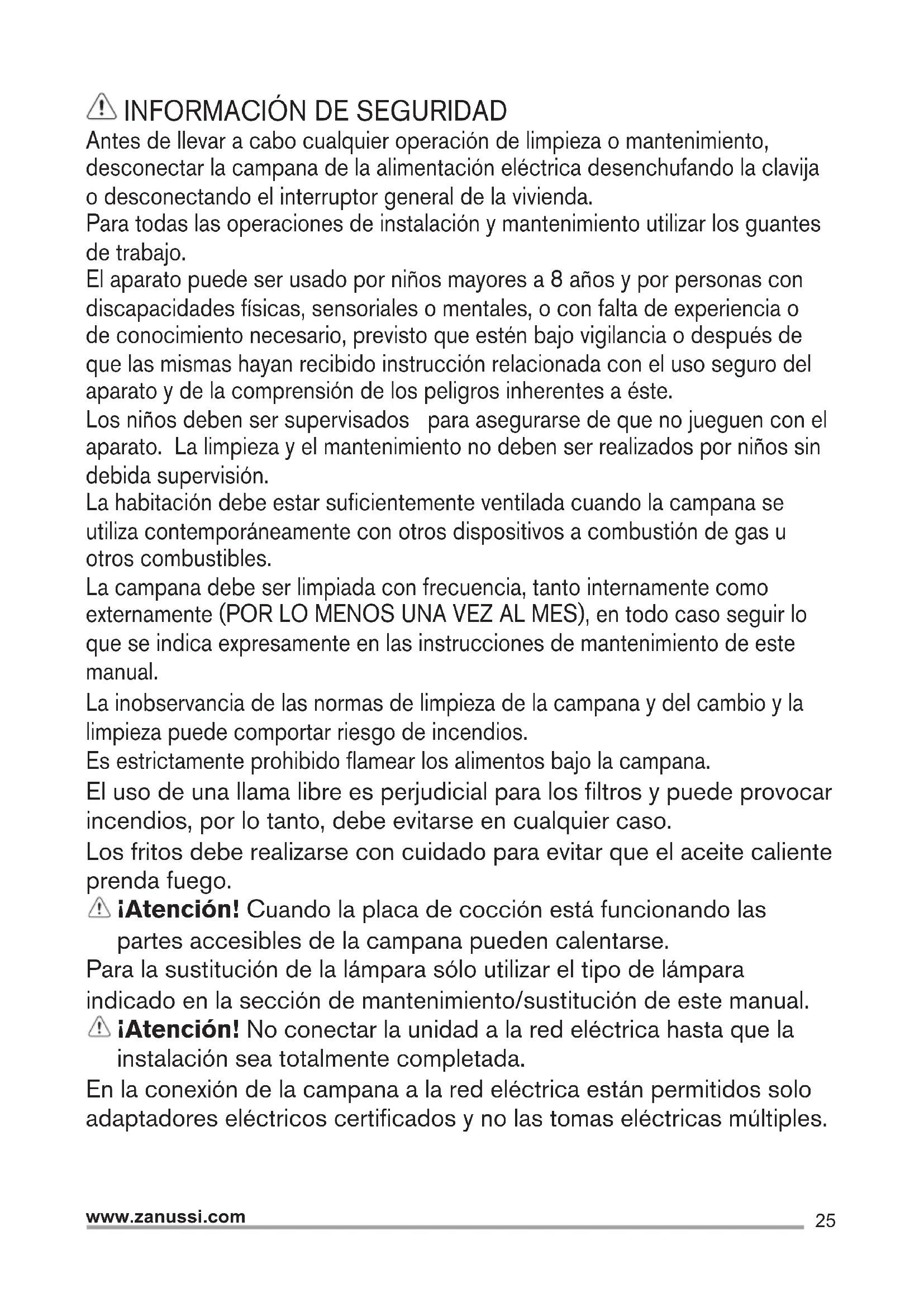 Antes de llevar a cabo cualquier operación de limpieza o mantenimiento, desconectar la campana de la alimentación eléctrica desenchufando la clavija o desconectando el interruptor general de la vivienda. Para todas las operaciones de instalación y mantenimiento utilizar los guantes de trabajo. El aparato puede ser usado por niños mayores a 8 años y por personas con discapacidades físicas, sensoriales o mentales, o con falta de experiencia o de conocimiento necesario, previsto que estén bajo vigilancia o después de que las mismas hayan recibido instrucción relacionada con el uso seguro del aparato y de la comprensión de los peligros inherentes a éste. Los niños deben ser supervisados para asegurarse de que no jueguen con el aparato. La limpieza y el mantenimiento no deben ser realizados por niños sin debida supervisión. La habitación debe estar suficientemente ventilada cuando la campana se utiliza contemporáneamente con otros dispositivos a combustión de gas u otros combustibles. La campana debe ser limpiada con frecuencia, tanto internamente como externamente (POR LO MENOS UNA VEZ AL MES), en todo caso seguir lo que se indica expresamente en las instrucciones de mantenimiento de este manual. La inobservancia de las normas de limpieza de la campana y del cambio y la limpieza puede comportar riesgo de incendios. Es estrictamente prohibido flamear los alimentos bajo la campana. El uso de una llama libre es perjudicial para los filtros y puede provocar incendios, por lo tanto, debe evitarse en cualquier caso. Los fritos debe realizarse con cuidado para evitar que el aceite caliente prenda fuego. ¡Atención! Cuando la placa de cocción está funcionando las partes accesibles de la campana pueden calentarse. Para la sustitución de la lámpara sólo utilizar el tipo de lámpara indicado en la sección de mantenimiento/sustitución de este manual. ¡Atención! No conectar la unidad a la red eléctrica hasta que la instalación sea totalmente completada. En la conexión de la campana a la red eléctrica están permitidos solo adaptadores eléctricos certificados y no las tomas eléctricas múltiples.26 www.zanussi.com