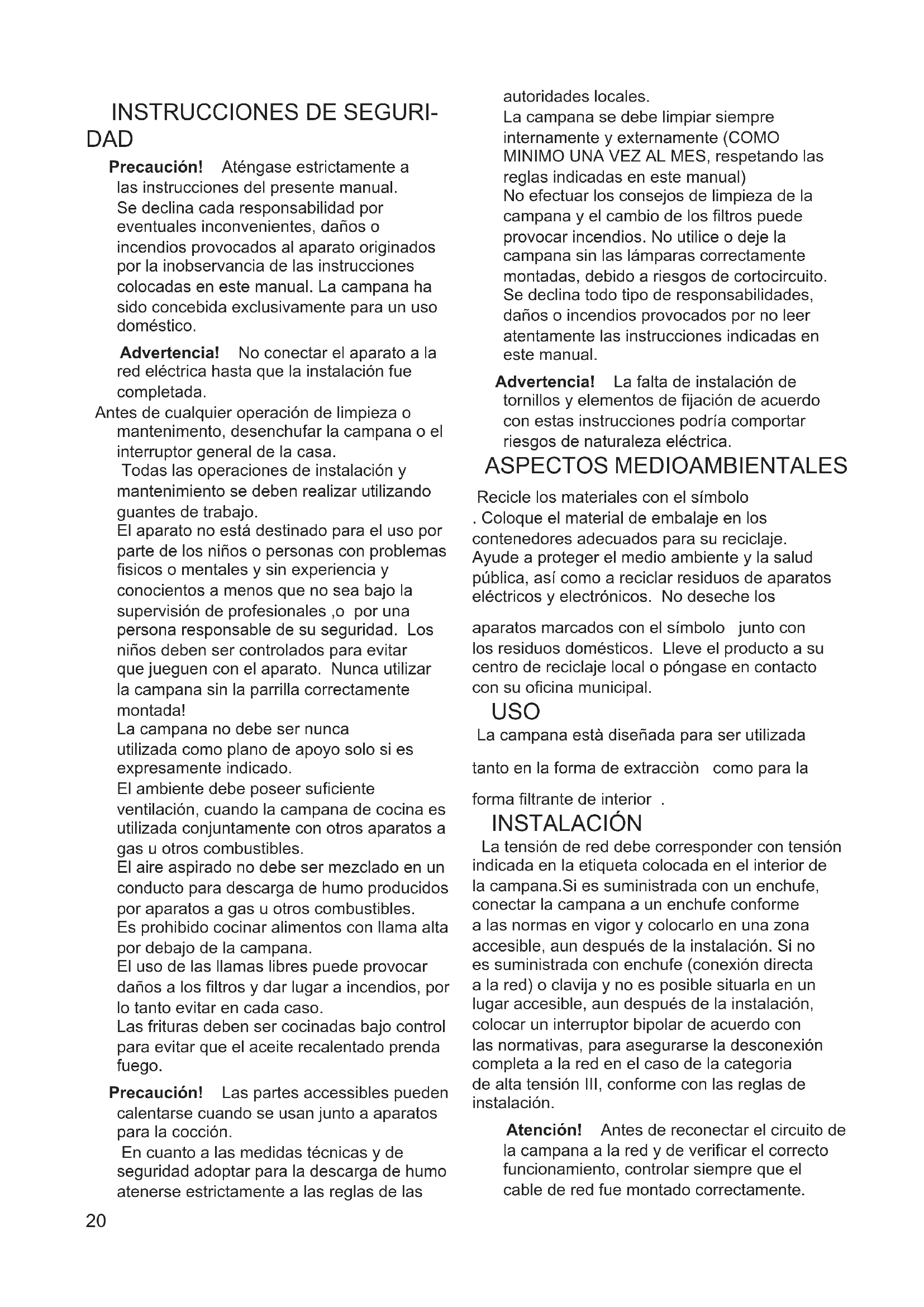 DAD Precaución! Aténgase estrictamente a las instrucciones del presente manual. Se declina cada responsabilidad por eventuales inconvenientes, daños o incendios provocados al aparato originados por la inobservancia de las instrucciones colocadas en este manual. La campana ha sido concebida exclusivamente para un uso doméstico. Advertencia! No conectar el aparato a la red eléctrica hasta que la instalación fue completada. Antes de cualquier operación de limpieza o mantenimento, desenchufar la campana o el interruptor general de la casa. Todas las operaciones de instalación y mantenimiento se deben realizar utilizando guantes de trabajo. El aparato no está destinado para el uso por parte de los niños o personas con problemas fisicos o mentales y sin experiencia y conocientos a menos que no sea bajo la supervisión de profesionales ,o por una persona responsable de su seguridad. Los niños deben ser controlados para evitar que jueguen con el aparato. Nunca utilizar la campana sin la parrilla correctamente montada! La campana no debe ser nunca utilizada como plano de apoyo solo si es expresamente indicado. El ambiente debe poseer suficiente ventilación, cuando la campana de cocina es utilizada conjuntamente con otros aparatos a gas u otros combustibles. El aire aspirado no debe ser mezclado en un conducto para descarga de humo producidos por aparatos a gas u otros combustibles. Es prohibido cocinar alimentos con llama alta por debajo de la campana. El uso de las llamas libres puede provocar daños a los filtros y dar lugar a incendios, por lo tanto evitar en cada caso. Las frituras deben ser cocinadas bajo control para evitar que el aceite recalentado prenda fuego. Precaución! Las partes accessibles pueden calentarse cuando se usan junto a aparatos para la cocción. En cuanto a las medidas técnicas y de seguridad adoptar para la descarga de humo atenerse estrictamente a las reglas de las autoridades locales. La campana se debe limpiar siempre internamente y externamente (COMO MINIMO UNA VEZ AL MES, respetando las reglas indicadas en este manual) No efectuar los consejos de limpieza de la campana y el cambio de los filtros puede provocar incendios. No utilice o deje la campana sin las lámparas correctamente montadas, debido a riesgos de cortocircuito. Se declina todo tipo de responsabilidades, daños o incendios provocados por no leer atentamente las instrucciones indicadas en este manual. Advertencia! La falta de instalación de tornillos y elementos de fijación de acuerdo con estas instrucciones podría comportar riesgos de naturaleza eléctrica. ASPECTOS MEDIOAMBIENTALES Recicle los materiales con el símbolo . Coloque el material de embalaje en los contenedores adecuados para su reciclaje. Ayude a proteger el medio ambiente y la salud pública, así como a reciclar residuos de aparatos eléctricos y electrónicos. No deseche los aparatos marcados con el símbolo junto con los residuos domésticos. Lleve el producto a su centro de reciclaje local o póngase en contacto con su oficina municipal. USO La campana està diseñada para ser utilizada tanto en la forma de extracciòn como para la forma filtrante de interior . INSTALACIÓN La tensión de red debe corresponder con tensión indicada en la etiqueta colocada en el interior de la campana.Si es suministrada con un enchufe, conectar la campana a un enchufe conforme a las normas en vigor y colocarlo en una zona accesible, aun después de la instalación. Si no es suministrada con enchufe (conexión directa a la red) o clavija y no es posible situarla en un lugar accesible, aun después de la instalación, colocar un interruptor bipolar de acuerdo con las normativas, para asegurarse la desconexión completa a la red en el caso de la categoria de alta tensión III, conforme con las reglas de instalación. Atención! Antes de reconectar el circuito de la campana a la red y de verificar el correcto funcionamiento, controlar siempre que el cable de red fue montado correctamente.21 La distancia mínima entre la superficie de cocción y la parte más baja de la campana no debe ser inferior a 50cm en el caso de cocinas electricas y de 65cm en el caso de cocinas a gas o mixtas. Si las instrucciones para la instalación del dispositivo para cocinar con gas especifican una distancia mayor, hay que tenerlo en consideración. MANTENIMIENTO ¡Atención! Antes de cualquier operación de limpieza o mantenimiento, retire la campana de la red eléctrica desconectando el enchufe o desconectando el interruptor general de la casa. La campana debe ser limpiada con frecuencia tanto externamente como internamente (con la misma frecuencia con la que se realiza el mantenimiento de los filtros de grasa). Para la limpieza, utilice un paño impregnado de detergente líquido neutro. No utilice productos que contengan abrasivos. ¡NO UTILICE ALCOHOL! ¡Atención! De no observarse las instrucciones dadas para limpiar el aparato y sustituir el filtro, puede producirse un incendio. El fabricante recomienda leerlas y respetarlas atentamente. El fabricante no se hace responsable por los daños al motor o los incendios provocados en el aparato debido a intervenciones de mantenimiento incorrectas o al incumplimiento de las normas de seguridad proporcionadas. Filtro antigrasa - El filtro antigrasa debe limpiarse una vez al mes con detergentes no agresivos, manualmente o bien en lavavajillas a bajas temperaturas y con ciclo breve. Con el lavado en el lavavajilla el filtro antigrasa metálico puede desteñirse pero sus características de filtrado no cambian absolutamente. Filtro al carbón activo - Type 20 LONG LIFE - Filtro al carbón activo lavable El filtro al carbón puede lavarse cada dos meses con agua caliente y detergentes adecuados o en lavavajillas a 65°C ( en caso de lavado con lavavajillas, realice el ciclo de lavado completo sin platos en el interior.). Quite el agua que haya quedado en el filtro sin estropearlo, después quite el almohadillado situa