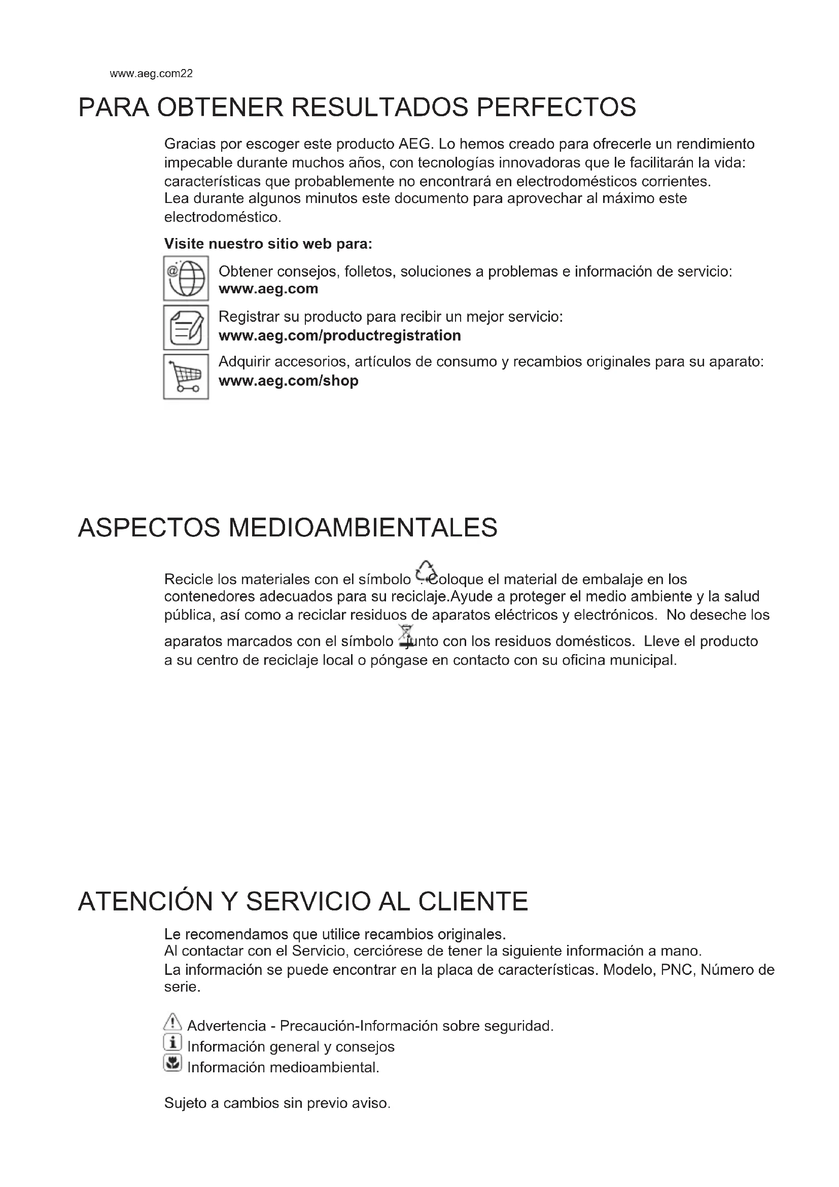 Gracias por escoger este producto AEG. Lo hemos creado para ofrecerle un rendimiento impecable durante muchos años, con tecnologías innovadoras que le facilitarán la vida: características que probablemente no encontrará en electrodomésticos corrientes. Lea durante algunos minutos este documento para aprovechar al máximo este electrodoméstico. Visite nuestro sitio web para: Obtener consejos, folletos, soluciones a problemas e información de servicio: www.aeg.com Registrar su producto para recibir un mejor servicio: www.aeg.com/productregistration Adquirir accesorios, artículos de consumo y recambios originales para su aparato: www.aeg.com/shop ASPECTOS MEDIOAMBIENTALES Recicle los materiales con el símbolo . Coloque el material de embalaje en los contenedores adecuados para su reciclaje.Ayude a proteger el medio ambiente y la salud pública, así como a reciclar residuos de aparatos eléctricos y electrónicos. No deseche los aparatos marcados con el símbolo junto con los residuos domésticos. Lleve el producto a su centro de reciclaje local o póngase en contacto con su oficina municipal.