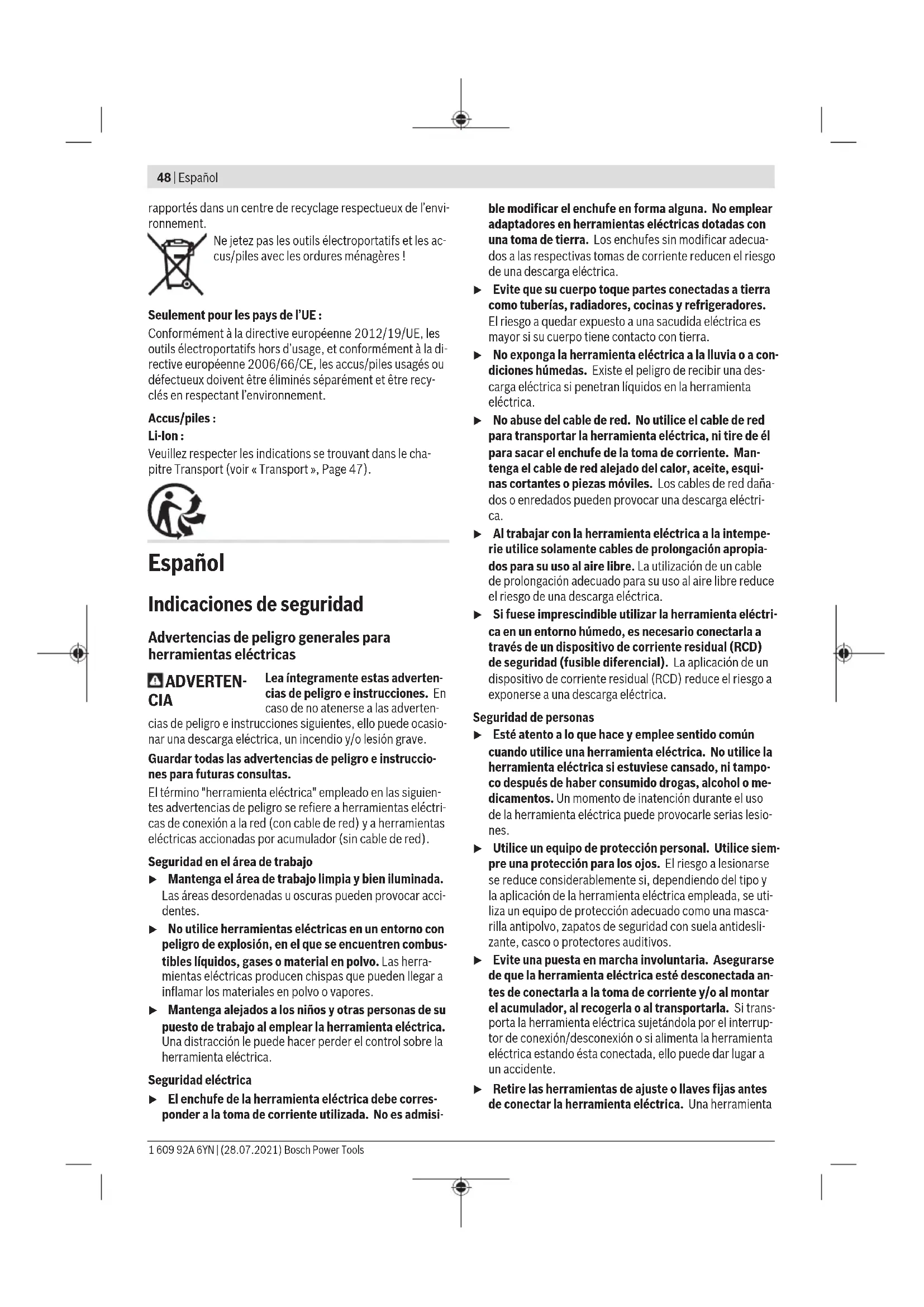 u Desmonte el acumulador antes de manipular la herra- mienta eléctrica (p. ej. en el mantenimiento, cambio de útil, etc.) así como al transportarla y guardarla. En caso contrario podría accidentarse al accionar fortuita- mente el interruptor de conexión/desconexión. 1 609 92A 6YN | (28.07.2021) Bosch Power ToolsEspañol | 59 Puede girar la cabeza del engranaje en pasos de 90 °. De este modo, el interrup- tor de conexión/descone- xión puede situarse en una posición de manejo más adecuada para casos espe- ciales, por ejemplo, para zurdos. Desenrosque totalmente los 4 tornillos. Gire la cabeza del engranaje cuidadosamente y sin quitarla de la caja a la nueva posición. Apriete de nue- vo firmemente los 4 tornillos. Aspiración de polvo y virutas El polvo de ciertos materiales como, pinturas que contengan plomo, ciertos tipos de madera y algunos minerales y meta- les, puede ser nocivo para la salud. El contacto y la inspira- ción de estos polvos pueden provocar en el usuario o en las personas circundantes reacciones alérgicas y/o enfermeda- des respiratorias. Ciertos polvos como los de roble, encina y haya son conside- rados como cancerígenos, especialmente en combinación con los aditivos para el tratamiento de la madera (cromatos, conservantes de la madera). Los materiales que contengan amianto solamente deberán ser procesados por especialis- tas. – Observe que esté bien ventilado el puesto de trabajo. – Se recomienda una mascarilla protectora con un filtro de la clase P2. Observe las prescripciones vigentes en su país sobre los ma- teriales a trabajar. u Evite acumulaciones de polvo en el puesto de trabajo. Los materiales en polvo se pueden inflamar fácilmente. Operación Puesta en marcha Montaje del acumulador Introduzca el acumulador (8) cargado desde delante en el pie de la herramienta eléctrica, hasta que el acumulador esté bloqueado de forma segura. Conexión/desconexión Para la puesta en servicio de la herramienta eléctrica des- place el interruptor de conexión/desconexión (6) hacia de- lante. Para fijar el interruptor de conexión/desconexión (6), pre- sione el interruptor de conexión/desconexión (6) por delan- te hacia abajo, hasta que encastre. Para desconectar la herramienta eléctrica, suelte el inte- rruptor de conexión/desconexión (6) o si está bloqueado, presione brevemente el interruptor de conexión/descone- xión (6) por detrás hacia abajo y luego suéltelo. u Compruebe los útiles abrasivos antes del uso. El útil abrasivo debe estar montado correctamente y debe poder girar libremente. Realice una marcha de prueba de como mínimo 1 minuto sin carga. No utilice útiles abrasivos dañados, excéntricos o que vibran. Los úti- les abrasivos dañados pueden estallar y originar lesiones. Desconexión de retroceso En el caso de un repentino contragolpe de la herramienta eléctrica, p. ej. bloqueo en el cor- te de separación, se interrumpe electrónica- mente la alimentación de corriente del motor. En ello, la luz de trabajo LED (4) parpadea en blanco y el indicador de estado (32) en rojo. Para la nueva puesta en marcha, coloque el interruptor de conexión/desconexión (6) en la posición de desconexión y conecte de nuevo la herramienta eléctrica. Protección contra rearranque La protección contra rearranque evita la puesta en marcha accidental de la herramienta eléctrica tras un corte de la ali- mentación eléctrica. Con la protección de rearranque activado, el indicador de estado (32) parpadea en rojo. Para la nueva puesta en marcha, coloque el interruptor de conexión/desconexión (6) en la posición de desconexión y conecte de nuevo la herramienta eléctrica. Desconexión de choque La desconexión de choque integrada desconecta la herra- mienta eléctrica, tan pronto ésta incide en el suelo tras una caída. En ello, el indicador de estado (32) parpadea en rojo. Para la nueva puesta en marcha, coloque el interruptor de conexión/desconexión (6) en la posición de desconexión y conecte de nuevo la herramienta eléctrica. Interfaz del usuario (ver figura B) La interfaz de usuario (5) sirve para la preselección de revo- luciones así como para la indicación del estado de la herra- mienta eléctrica. Preselección de revoluciones