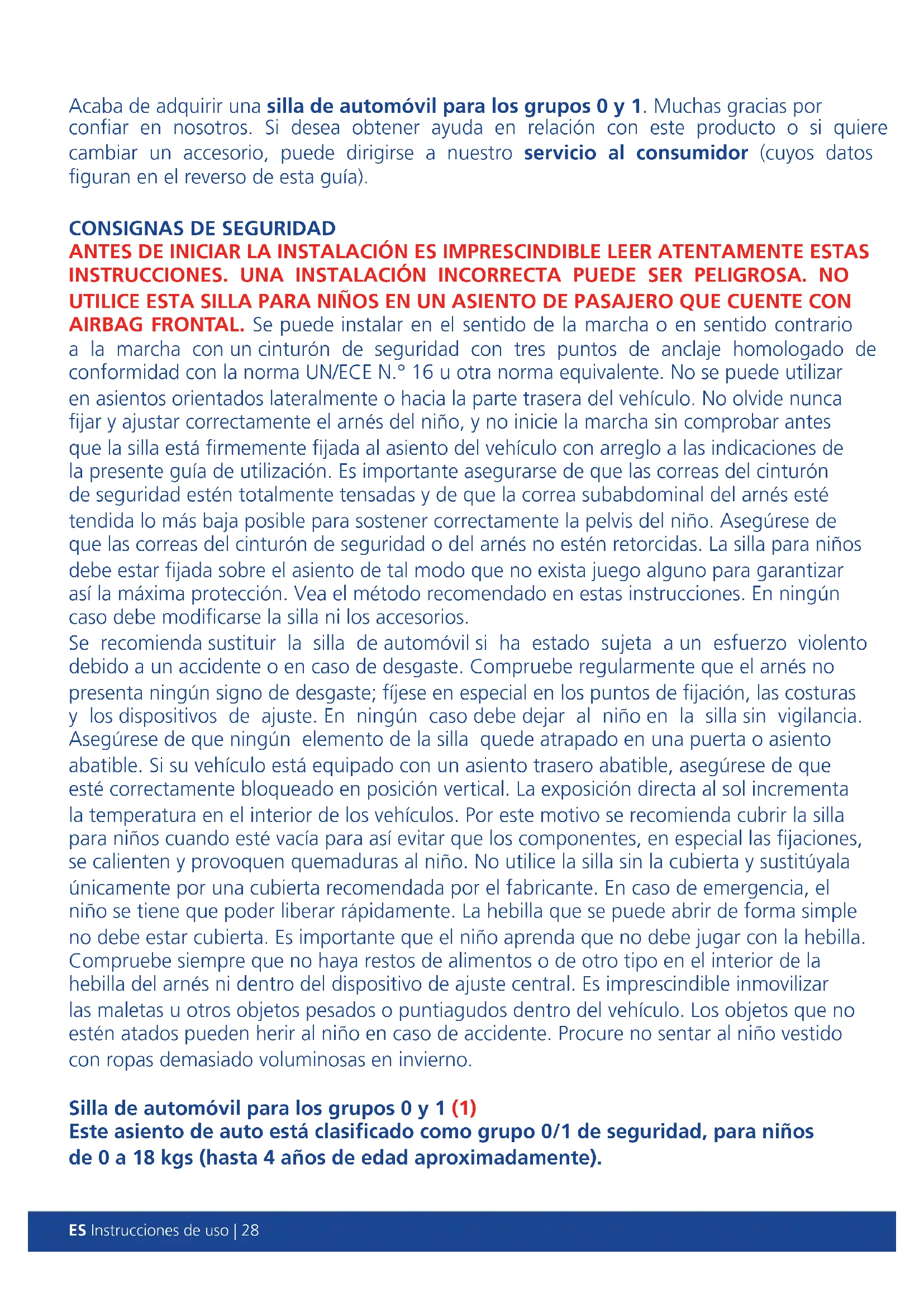 ANTES DE INICIAR LA INSTALACIÓN ES IMPRESCINDIBLE LEER ATENTAMENTE ESTAS INSTRUCCIONES. UNA INSTALACIÓN INCORRECTA PUEDE SER PELIGROSA. NO UTILICE ESTA SILLA PARA NIÑOS EN UN ASIENTO DE PASAJERO QUE CUENTE CON AIRBAG FRONTAL. Se puede instalar en el sentido de la marcha o en sentido contrario a la marcha con un cinturón de seguridad con tres puntos de anclaje homologado de conformidad con la norma UN/ECE N.° 16 u otra norma equivalente. No se puede utilizar en asientos orientados lateralmente o hacia la parte trasera del vehículo. No olvide nunca fijar y ajustar correctamente el arnés del niño, y no inicie la marcha sin comprobar antes que la silla está firmemente fijada al asiento del vehículo con arreglo a las indicaciones de la presente guía de utilización. Es importante asegurarse de que las correas del cinturón de seguridad estén totalmente tensadas y de que la correa subabdominal del arnés esté tendida lo más baja posible para sostener correctamente la pelvis del niño. Asegúrese de que las correas del cinturón de seguridad o del arnés no estén retorcidas. La silla para niños debe estar fijada sobre el asiento de tal modo que no exista juego alguno para garantizar así la máxima protección. Vea el método recomendado en estas instrucciones. En ningún caso debe modificarse la silla ni los accesorios. Se recomienda sustituir la silla de automóvil si ha estado sujeta a un esfuerzo violento debido a un accidente o en caso de desgaste. Compruebe regularmente que el arnés no presenta ningún signo de desgaste; fíjese en especial en los puntos de fijación, las costuras y los dispositivos de ajuste. En ningún caso debe dejar al niño en la silla sin vigilancia. Asegúrese de que ningún elemento de la silla quede atrapado en una puerta o asiento abatible. Si su vehículo está equipado con un asiento trasero abatible, asegúrese de que esté correctamente bloqueado en posición vertical. La exposición directa al sol incrementa la temperatura en el interior de los vehículos. Por este motivo se recomienda cubrir la silla para niños cuando esté vacía para así evitar que los componentes, en especial las fijaciones, se calienten y provoquen quemaduras al niño. No utilice la silla sin la cubierta y sustitúyala únicamente por una cubierta recomendada por el fabricante. En caso de emergencia, el niño se tiene que poder liberar rápidamente. La hebilla que se puede abrir de forma simple no debe estar cubierta. Es importante que el niño aprenda que no debe jugar con la hebilla. Compruebe siempre que no haya restos de alimentos o de otro tipo en el interior de la hebilla del arnés ni dentro del dispositivo de ajuste central. Es imprescindible inmovilizar las maletas u otros objetos pesados o puntiagudos dentro del vehículo. Los objetos que no estén atados pueden herir al niño en caso de accidente. Procure no sentar al niño vestido con ropas demasiado voluminosas en invierno. Silla de automóvil para los grupos 0 y 1 (1) Este asiento de auto está clasificado como grupo 0/1 de seguridad, para niños de 0 a 18 kgs (hasta 4 años de edad aproximadamente).Instrucciones de uso ES | 29