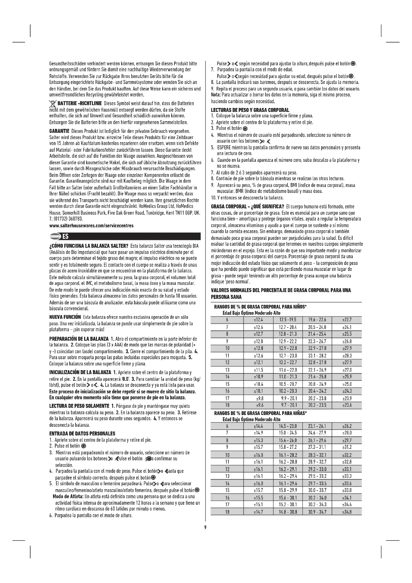 ¿Cómo se miden exactamente mi grasa y agua corporales? Esta balanza Salter usa un método para medir que se llama Análisis de Bio Impedancia (BIA). Un impulse eléctrico diminuto se hace pasar por el cuerpo a través de los pies y las piernas. Esta corriente fluye fácilmente a través de los tejidos musculares magros, que tienen un alto contenido de líquido, pero no lo hace fácilmente a través de la grasa. Por consiguiente, al medir la impedancia de su cuerpo (es decir, su resistencia a la corriente), puede determinarse la cantidad de músculo. Basándose en esto es posible evaluar la cantidad de grasa y agua.11 ¿Cuál es el valor de la corriente que pasa a través de mi cuerpo cuando se realiza esta medición? ¿Es segura? La corriente es inferior a 1 mA, que es minúscula y perfectamente segura. Ni la sentirá. Sin embargo, este dispositivo no debe ser utilizado por nadie que lleve un dispositivo médico electrónico interno, como un marcapasos, como precaución en caso de que causara interferencia con este dispositivo. Si mido mi grasa y agua corporales a diferentes horas durante el día, pueden variar considerablemente. ¿Cuál valor es el verdadero? La lectura del porcentaje de grasa corporal varía según el contenido de agua corporal, el cual cambia durante el curso del día. Ninguna hora del día es correcta o incorrecta para tomar una lectura, pero procure tomar las medidas siempre a la misma hora y cuando considere que su cuerpo está hidratado normalmente. Procure no tomar lecturas después de tomar un baño o una sauna, después de ejercicio intenso o dentro del período de 1-2 horas después de comer o beber mucho. Mi amigo tiene una Analizadora de Grasa Corporal de otra marca. Cuando la utilicé noté que la lectura de grasa corporal era diferente. A qué se debe esto? Diferentes analizadores de grasa corporal realizan mediciones en diferentes partes del cuerpo y utilizan diferentes algoritmos matemáticos para calcular el porcentaje de grasa corporal. Lo más aconsejable es no realizar comparaciones entre dispositivos sino utilizar siempre el mismo dispositivo vez para monitorizar cualquier cambio. ¿Cómo interpreto las lecturas de mis porcentajes de grasa y agua corporales? Consulte las tablas de grasa y agua corporales adjuntas con el producto. Ellas le indicarán si sus lecturas de grasa y agua corporales corresponden a una categoría sana (en relación con su edad y sexo). ¿Qué debo hacer si mi lectura de grasa corporal es muy alta? Un programa adecuado de dieta, consumo de líquido y ejercicio puede reducir su porcentaje de grasa corporal. Debe solicitarse siempre orientación médica antes de iniciar un programa de este tipo. ¿Por qué las gamas de porcentajes de grasa corporal de los hombres y las mujeres son tan diferentes? Las mujeres tienen naturalmente un porcentaje mayor de grasa que los hombres, debido a que la composición de su cuerpo es diferente al estar dirigida al embarazo, la lactancia etc. ¿Qué debo hacer si la lectura de mi porcentaje de agua corporal es ‘baja’? Debe asegurarse de beber suficiente agua y trabajar para reducir su porcentaje de grasa hasta que esté dentro de la gama sana. ¿Por qué debo evitar usar la Balanza Analizadora Corporal durante el embarazo? Durante el embarazo la composición del cuerpo de una mujer cambia considerablemente para sustentar al niño en desarrollo. Bajo estas circunstancias, el porcentaje de grasa corporal puede ser inexacto y confuso. Por tanto, las mujeres embarazadas deben usar únicamente la función de peso. CONSEJOS DE USO Y CUIDADO • Pésese siempre con la misma balanza, situada en la misma superficie del suelo. No compare las lecturas de pesos obtenidos con diferentes balanzas ya que habrá diferencias causadas por las tolerancias de fabricación. • La colocación de su balanza en un suelo duro y uniforme garantiza una exactitud y una regularidad óptimas. • Para obtener resultados de una forma sistemática, se recomienda que realice las mediciones a la misma hora del día, preferiblemente al anochecer, antes de cenar. • La balanza redondea la lectura hacia arriba o hacia abajo, al valor más cercano. Si se pesa dos veces y obtiene dos lecturas distintas, su peso es un valor intermedio. • Limpie la balanza con un paño húmedo. No utilice agentes de limpieza químicos. • No permita que la balanza se moje ya que esto puede dañar los componentes electrónicos. • Trate la balanza con cuidado - es un instrumento de precisión. No la deje caer ni salte sobre ella. GUÍA DE RESOLUCIÓN DE PROBLEMAS • Cuando realice las mediciones de grasa corporal y agua corporal total debe estar descalzo. • El estado de la piel de la planta de sus pies puede afectar la lectura. Para obtener lalectura más exacta y consistente posibles, límpiese los pies con un paño húmedo, dejándolos ligeramente húmedos antes de subir a la balanza.