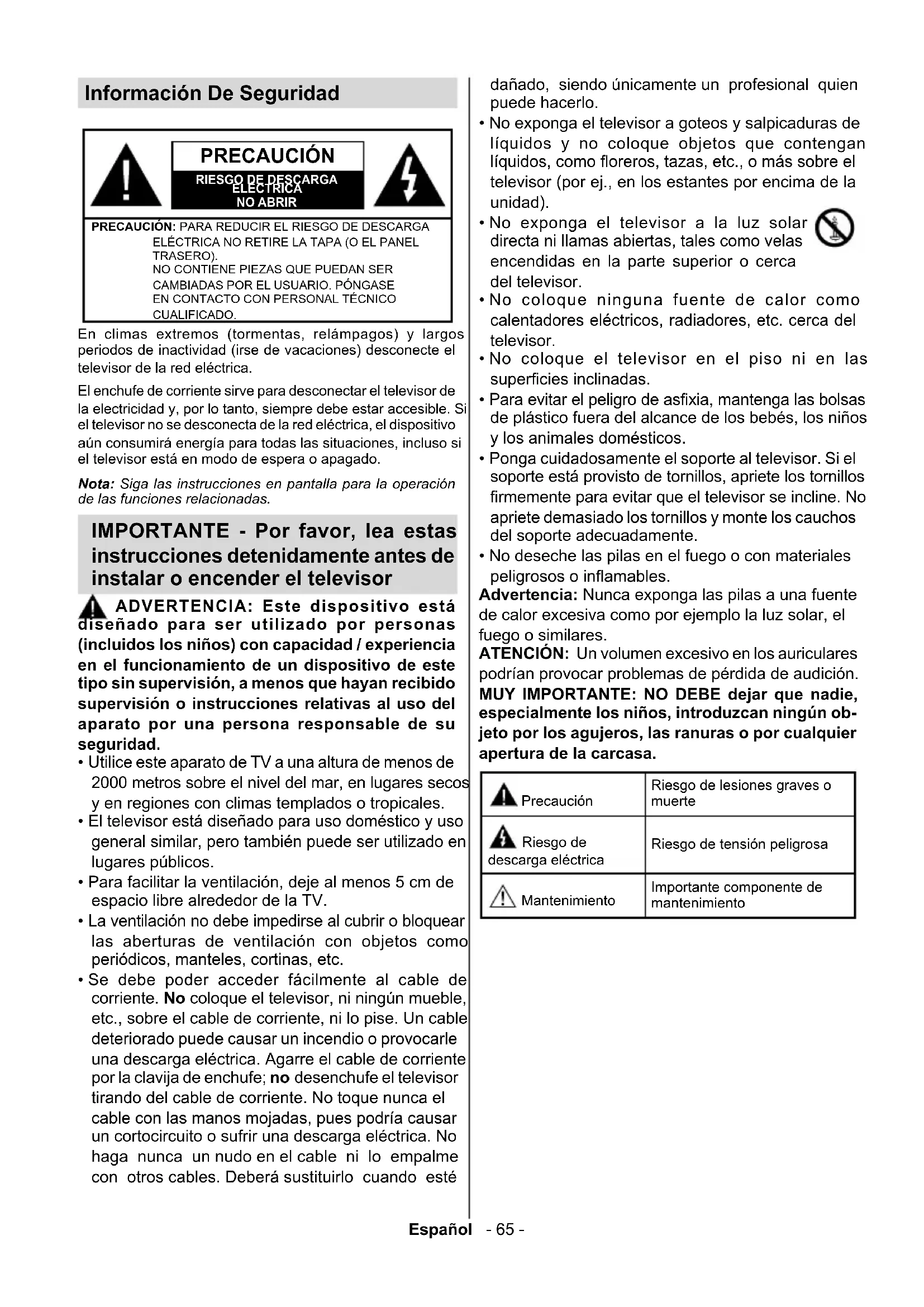 Licencias...............................................................70 Especicaciones de LAN inalámbrica(**) .............71Español - 65 - Información De Seguridad PRECAUCIÓN