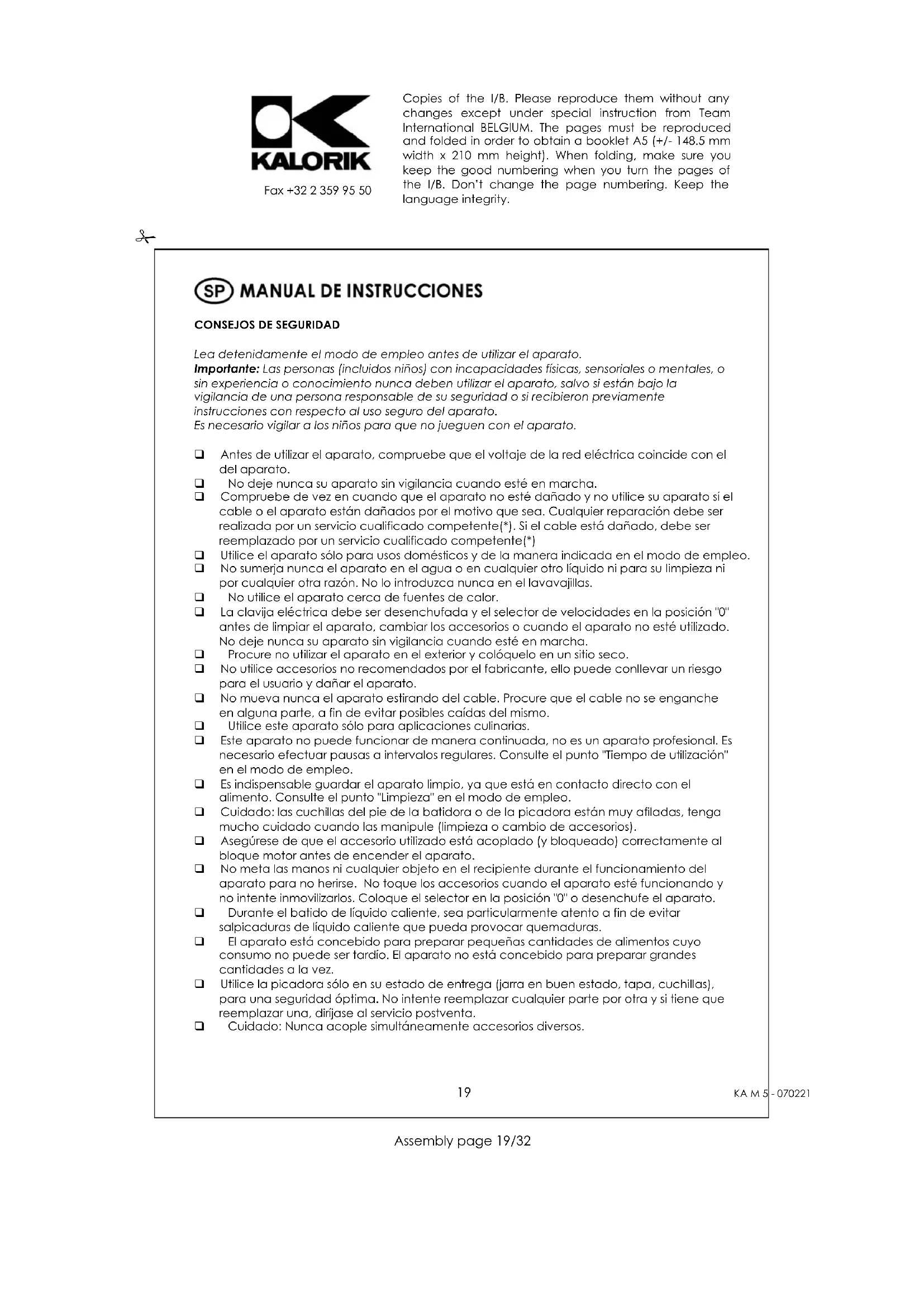 Lea detenidamente el modo de empleo antes de utilizar el aparato. Importante: Las personas (incluidos niños) con incapacidades físicas, sensoriales o mentales, o sin experiencia o conocimiento nunca deben utilizar el aparato, salvo si están bajo la vigilancia de una persona responsable de su seguridad o si recibieron previamente instrucciones con respecto al uso seguro del aparato. Es necesario vigilar a los niños para que no jueguen con el aparato. Antes de utilizar el aparato, compruebe que el voltaje de la red eléctrica coincide con el del aparato. No deje nunca su aparato sin vigilancia cuando esté en marcha. Compruebe de vez en cuando que el aparato no esté dañado y no utilice su aparato sí el cable o el aparato están dañados por el motivo que sea. Cualquier reparación debe ser realizada por un servicio cualificado competente(*). Si el cable está dañado, debe ser reemplazado por un servicio cualificado competente(*) Utilice el aparato sólo para usos domésticos y de la manera indicada en el modo de empleo. No sumerja nunca el aparato en el agua o en cualquier otro líquido ni para su limpieza ni por cualquier otra razón. No lo introduzca nunca en el lavavajillas. No utilice el aparato cerca de fuentes de calor. La clavija eléctrica debe ser desenchufada y el selector de velocidades en la posición "0" antes de limpiar el aparato, cambiar los accesorios o cuando el aparato no esté utilizado. No deje nunca su aparato sin vigilancia cuando esté en marcha. Procure no utilizar el aparato en el exterior y colóquelo en un sitio seco. No utilice accesorios no recomendados por el fabricante, ello puede conllevar un riesgo para el usuario y dañar el aparato. No mueva nunca el aparato estirando del cable. Procure que el cable no se enganche en alguna parte, a fin de evitar posibles caídas del mismo. Utilice este aparato sólo para aplicaciones culinarias. Este aparato no puede funcionar de manera continuada, no es un aparato profesional. Es necesario efectuar pausas a intervalos regulares. Consulte el punto "Tiempo de utilización" en el modo de empleo. Es indispensable guardar el aparato limpio, ya que está en contacto directo con el alimento. Consulte el punto "Limpieza" en el modo de empleo. Cuidado: las cuchillas del pie de la batidora o de la picadora están muy afiladas, tenga mucho cuidado cuando las manipule (limpieza o cambio de accesorios). Asegúrese de que el accesorio utilizado está acoplado (y bloqueado) correctamente al bloque motor antes de encender el aparato. No meta las manos ni cualquier objeto en el recipiente durante el funcionamiento del aparato para no herirse. No toque los accesorios cuando el aparato esté funcionando y no intente inmovilizarlos. Coloque el selector en la posición "0" o desenchufe el aparato. Durante el batido de líquido caliente, sea particularmente atento a fin de evitar salpicaduras de líquido caliente que pueda provocar quemaduras. El aparato está concebido para preparar pequeñas cantidades de alimentos cuyo consumo no puede ser tardío. El aparato no está concebido para preparar grandes cantidades a la vez. Utilice la picadora sólo en su estado de entrega (jarra en buen estado, tapa, cuchillas), para una seguridad óptima. No intente reemplazar cualquier parte por otra y si tiene que reemplazar una, diríjase al servicio postventa. Cuidado: Nunca acople simultáneamente accesorios diversos. 19 KA M 5 - 070221