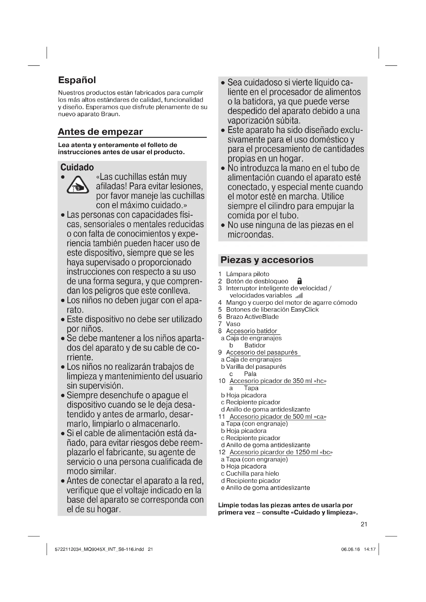 No use ninguna de las piezas en el microondas. Piezas y accesorios 1 Lámpara piloto 2 Botón de desbloqueo 3 Interruptor inteligente de velocidad / velocidades variables 4 Mango y cuerpo del motor de agarre cómodo 5 Botones de liberación EasyClick 6 Brazo ActiveBlade 7 Vaso 8 Accesorio batidor a Caja de engranajes b Batidor 9 Accesorio del pasapurés a Caja de engranajes b Varilla del pasapurés c Pala 10 Accesorio picador de 350 ml «hc» a Tapa b Hoja picadora c Recipiente picador d Anillo de goma antideslizante 11 Accesorio picador de 500 ml «ca» a Tapa (con engranaje) b Hoja picadora c Recipiente picador d Anillo de goma antideslizante 12 Accesorio picardor de 1250 ml «bc» a Tapa (con engranaje) b Hoja picadora c Cuchilla para hielo d Recipiente picador e Anillo de goma antideslizante Limpie todas las piezas antes de usarla por primera vez – consulte «Cuidado y limpieza». 5722112034_MQ9045X_INT_S6-116.indd 215722112034_MQ9045X_INT_S6-116.indd 21 06.06.16 14:1706.06.16 14:1722 Lámpara piloto La lámpara piloto (1) muestra el estado del aparato, cuando está conectado a un tomacorriente. Lámpara piloto Aparato/Estado de operación Parpadeando en rojo El aparato está listo para usarse. Verde continuo El aparato está liberado (se ha pulsado el botón de liberación del interruptor) y se puede encender. Rojo continuo Aviso temprano de sobrecalen- tamiento. El motor desacelera, poco a poco, hasta detenerse. Espere a que se enfríe. Estará listo para usar de nuevo cuando el piloto parpadee en rojo. Si la velocidad máxima disminuye con carga alta y funcionamiento prolongado, puede terminar su preparación igualmente, siempre y cuando deje enfriar después el aparato. Cómo usar el aparato Interruptor inteligente de velocidad para velocidades variables Un apretón, todas las velocidades. Entre más pulse, mayor será la velocidad. Cuanto mayor sea la velocidad, más rápidos y más finos serán los resultados de mezclado y picado. Operación con una mano: el interruptor inteligente de velocidad (3) le permite encender el aparato y controlar la velocidad con una mano. Operación de su batidora de mano Primer uso: Quite el bloqueo de transporte del cuerpo del motor (4) tirando de la cinta roja. Encendido (A) El aparato viene equipado con un botón de desbloqueo para liberar el interruptor de velocidad inteligente. Para encenderlo, siga estos puntos: