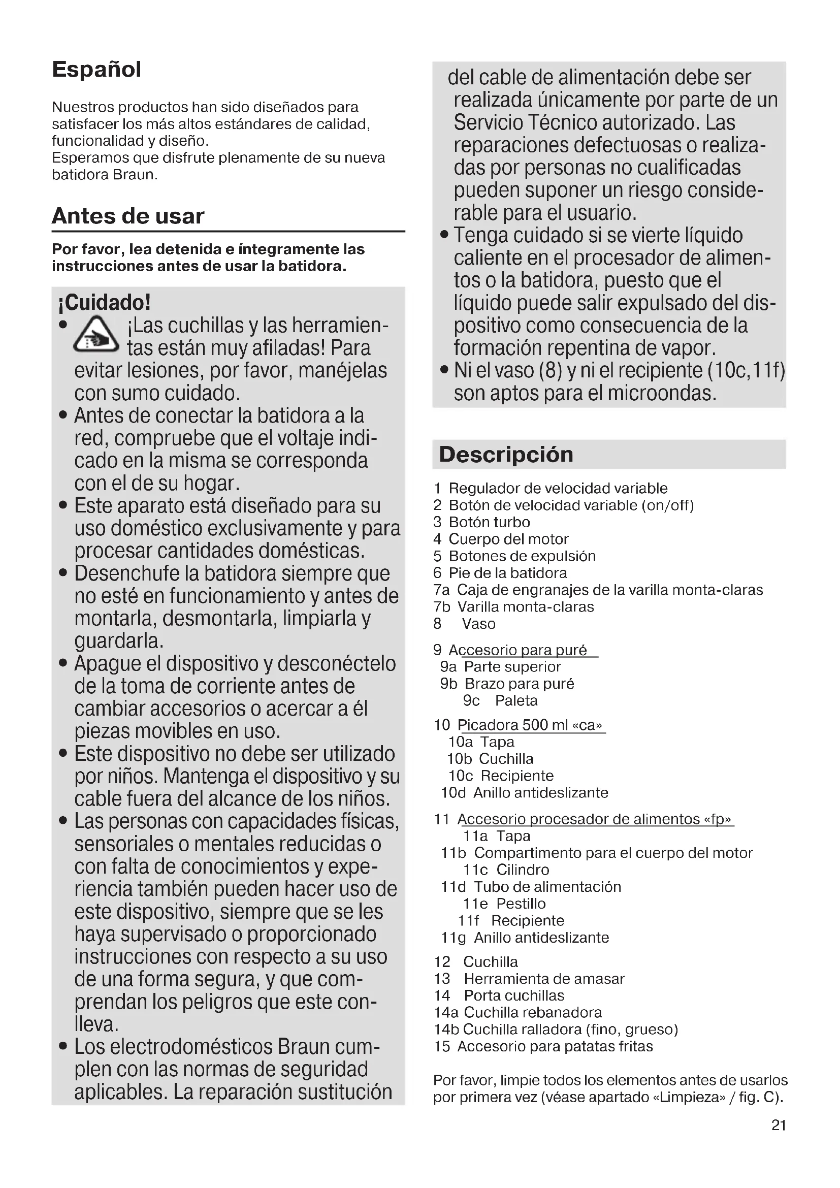 No introduzca nunca los dedos por el tubo de alimentación cuando la batidora esté en funcionamiento. Utilice siempre el cilindro (11c) para empujar los alimentos.