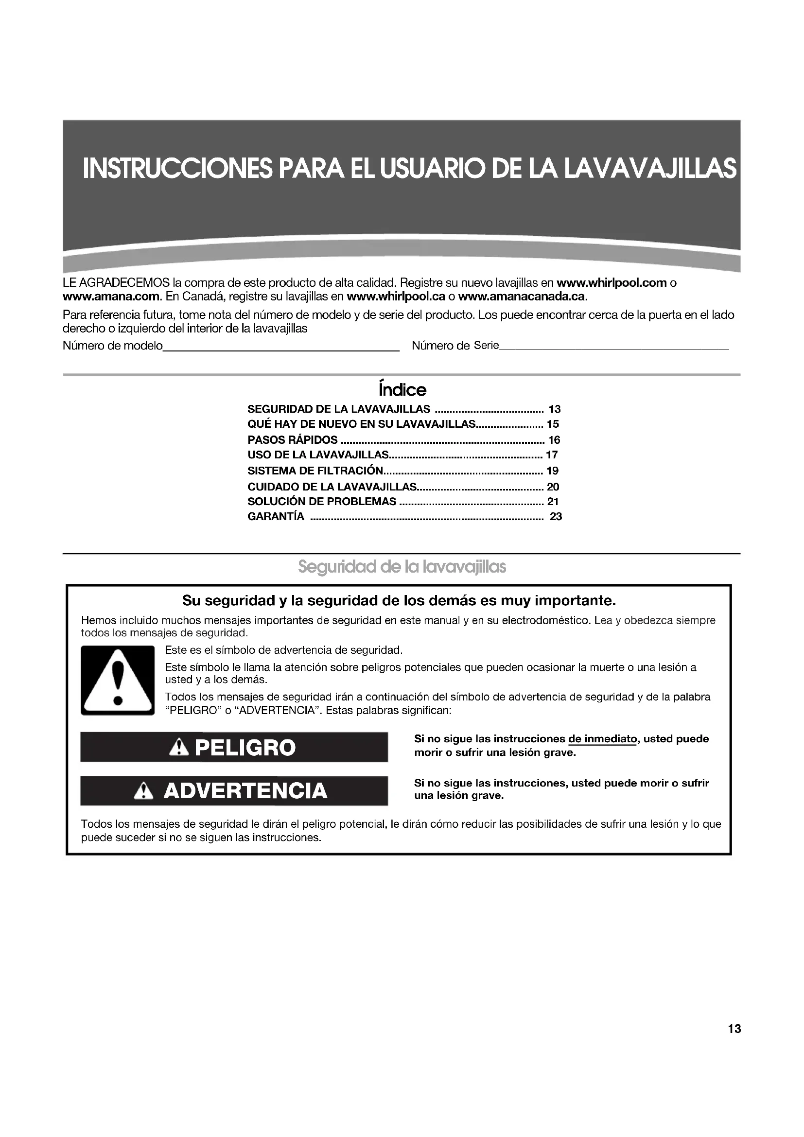 - /™ ©2014. Used under license in Canada. All rights reserved. 9/14 Printed in U.S.A.13 LE AGRADECEMOS la compra de este producto de alta calidad. Registre su nuevo lavajillas en www.whirlpool.com o www.amana.com. En Canadá, registre su lavajillas en www.whirlpool.ca o www.amanacanada.ca. Para referencia futura, tome nota del número de modelo y de serie del producto. Los puede encontrar cerca de la puerta en el lado derecho o izquierdo del interior de la lavavajillas Número de modelo_________________________________________ Número de Serie__________________________________________ Seguridad de la lavavajillas Índice SEGURIDAD DE LA LAVAVAJILLAS p. 13