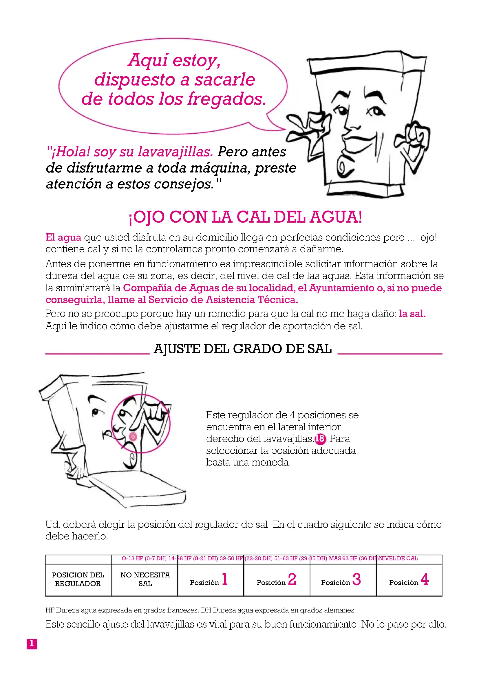 Este regulador de 4 posiciones se encuentra en el lateral interior derecho del lavavajillas. Para seleccionar la posición adecuada, basta una moneda. Ud. deberá elegir la posición del regulador de sal. En el cuadro siguiente se indica cómo debe hacerlo. Este sencillo ajuste del lavavajillas es vital para su buen funcionamiento. No lo pase por alto. HF Dureza agua expresada en grados franceses. DH Dureza agua expresada en grados alemanes.O-13 HF (0-7 DH) 14-38 HF (8-21 DH) 39-50 HF (22-28 DH) 51-63 HF (29-35 DH) MAS 63 HF (36 DH)NIVEL DE CALNO NECESITA SAL POSICION DELREGULADORPosición 1 Posición 2 Posición 3 Posición 4