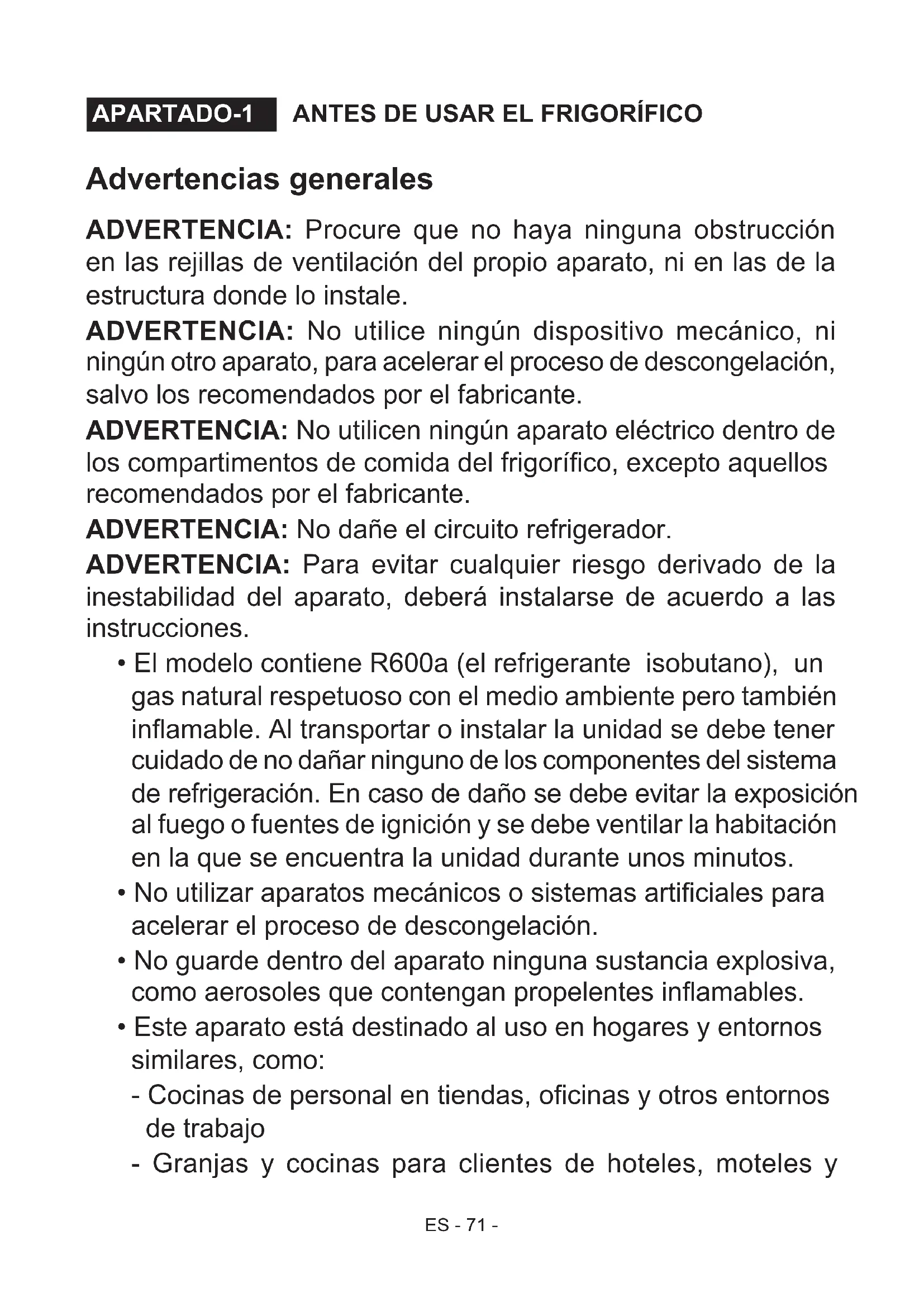 Advertencias generales ADVERTENCIA: Procure que no haya ninguna obstrucción en las rejillas de ventilación del propio aparato, ni en las de la estructura donde lo instale. ADVERTENCIA: No utilice ningún dispositivo mecánico, ni ningún otro aparato, para acelerar el proceso de descongelación, salvo los recomendados por el fabricante. ADVERTENCIA: No utilicen ningún aparato eléctrico dentro de los compartimentos de comida del frigoríco, excepto aquellos recomendados por el fabricante. ADVERTENCIA: No dañe el circuito refrigerador. ADVERTENCIA: Para evitar cualquier riesgo derivado de la inestabilidad del aparato, deberá instalarse de acuerdo a las instrucciones.