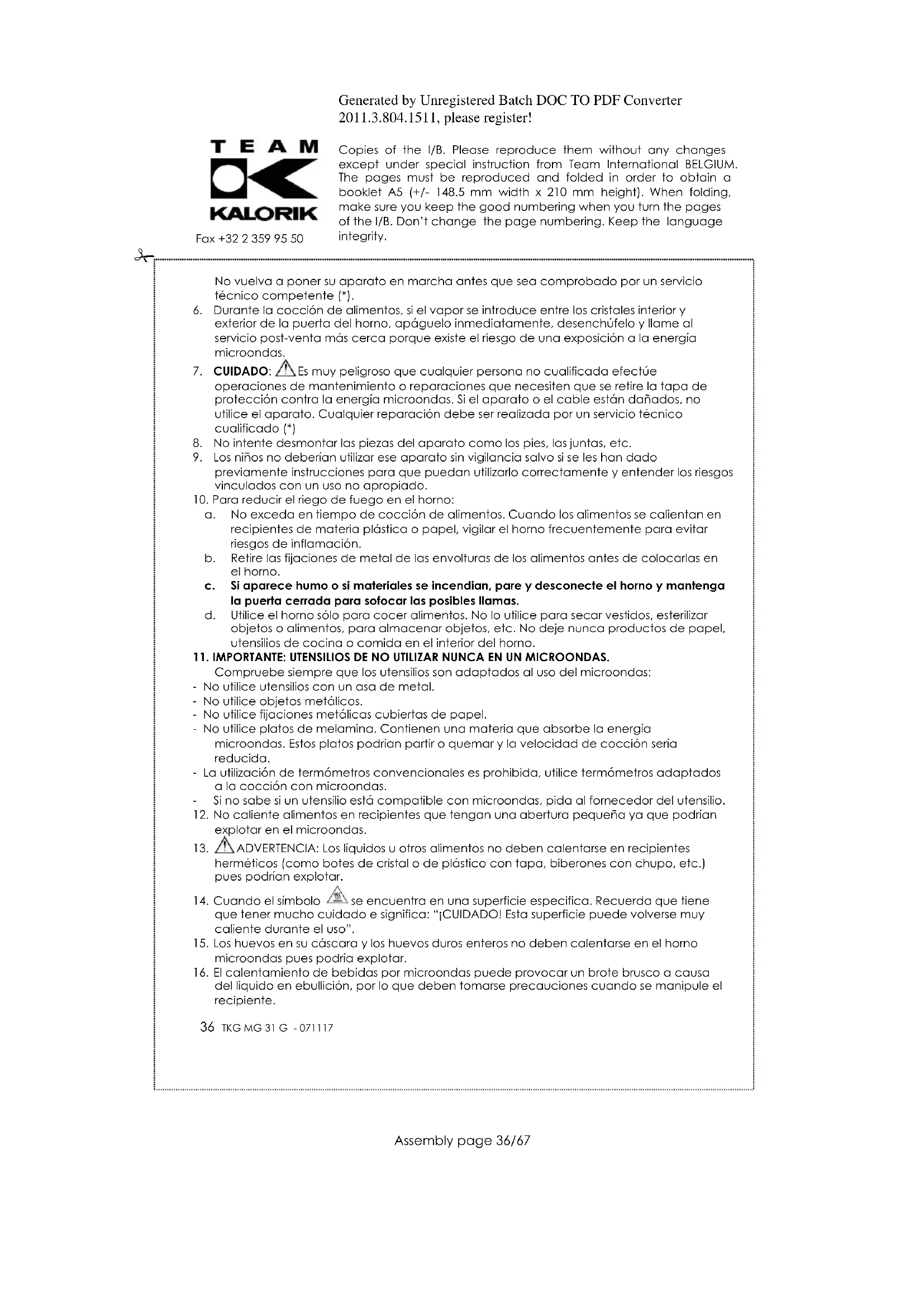 Para poder preservar nuestro medio ambiente y proteger la salud humana, los residuos eléctricos y equipos electrónicos deberían ser destruidos de acuerdo con unas normas especificas con la implicación de ambos proveedores y consumidores. Por esta razón, como indica el símbolo en la placa de datos técnicos, su aparato no debería ser tirado en un contenedor municipal sino que debería ser devuelto a la tienda, o dejado en un punto de recolección para ser reciclado o usado para otras aplicaciones conforme a la directiva.Generated by Unregistered Batch DOC TO PDF Converter 2011.3.804.1511, please register! Copies of the I/B. Please reproduce them without any changes except under special instruction from Team International BELGIUM. The pages must be reproduced and folded in order to obtain a booklet A5 (+/- 148.5 mm width x 210 mm height). When folding, make sure you keep the good numbering when you turn the pages of the I/B. Don‟t change the page numbering. Keep the language integrity.
