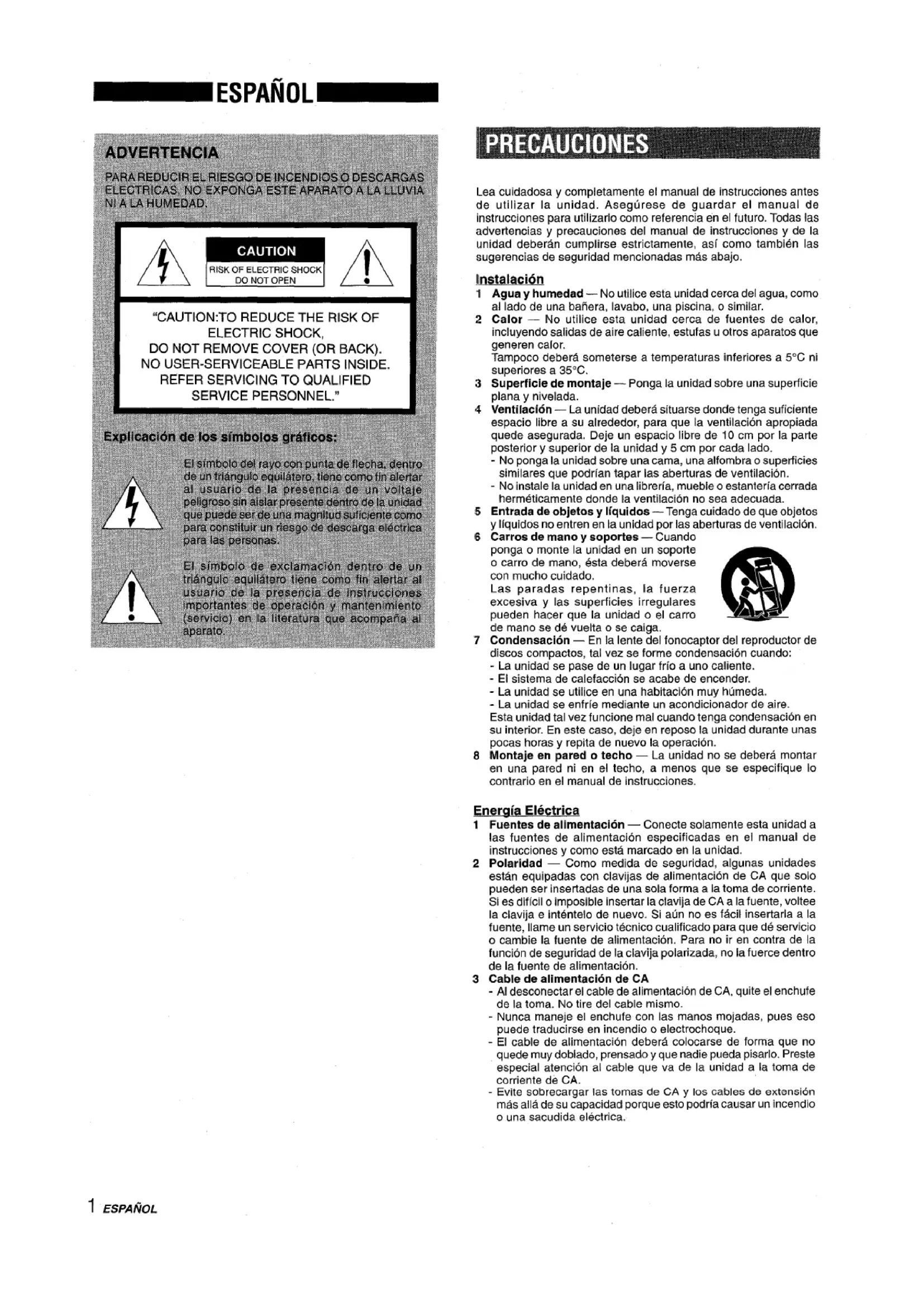 excesiva y Ias superficies irregulars pueden hater que la unidad o el carro AL* de mano se de vuelta o se caiga. Condensation — En la Iente del fonocaptor del reproductor de discos compactos, tal vez se forme condensation cuando: - La unidad se pase de un Iugar frio a uno caliente. - El sistema de calefaccion se acabe de encender. - La unidad se utilice en una habitation muy hbmeda. - La unidad se enfrie mediante un acondicionador de aire. Esta unidad tal vez funcione mal cuando tenga condensation en su interior. En este case, deje en reposo la unidad durante unas pocas horas y repita de nuevo la operation. Montaje en pared o techo — La unidad no se debera montar en una pared ni en el techo, a menos que se especifique 10 contrario en el manual de instrucciones. Enercfia Electrica