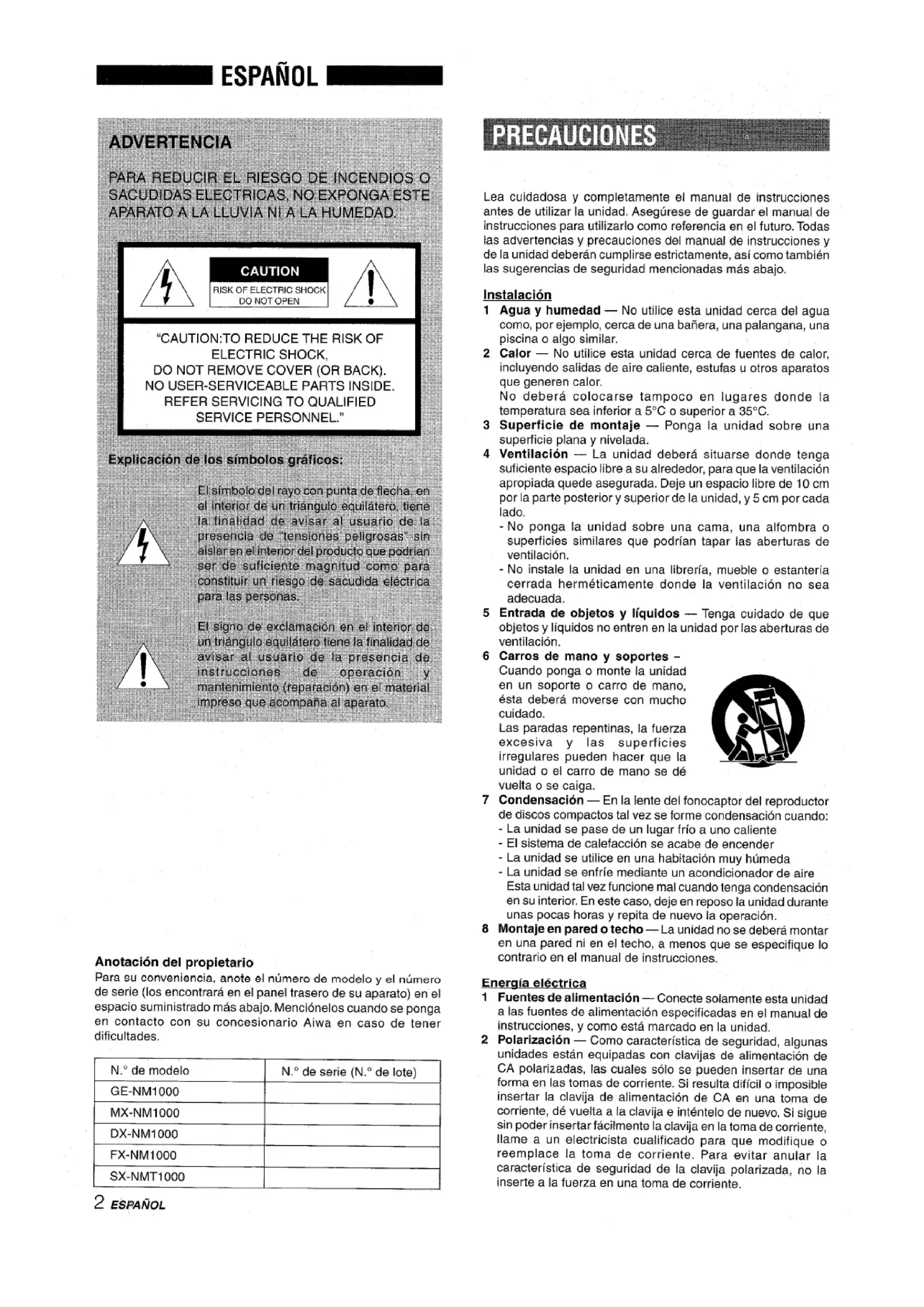SERVICE PERSONNEL.” Anotacion del propietario Para su conveniencia, anote el numero de modelo y el ntimero de serie (Ios encontrara en el panel trasero de su aparato) en el espacio suministrado mas abajo. Mencionelos cuando se ponga en contacto con su concesionario Aiwa en caso de tener dificultades,
