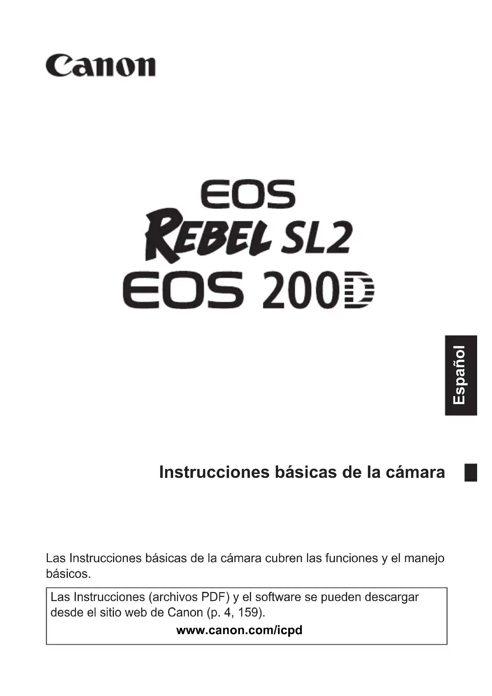 Visionnement des images.......... W-29 IndexLes descriptions dans ce mode d’emploi datent de mars 2017. Pour des informations sur la compatibilité avec des produits commercialisés après cette date, prenez contact avec un Service Après-Vente Canon. Pour le mode d’emploi le plus récent, consultez le site Web de Canon.Las Instrucciones básicas de la cámara cubren las funciones y el manejo básicos. Las Instrucciones (archivos PDF) y el software se pueden descargar desde el sitio web de Canon (p. 4, 159). Instrucciones básicas de la cámara Español www.canon.com/icpd2 La EOS REBEL SL2 o EOS 200D es una cámara SLR digital que incorpora un sensor CMOS de elevado nivel de detalle con aprox. 24,2 megapíxeles efectivos, DIGIC 7, AF de 9 puntos de alta precisión y alta velocidad, velocidad máxima de disparos en serie de aprox. 5,0 fps, disparo con Visión en Directo, grabación de vídeo de alta definición completa (Full HD) y función Wi-Fi/NFC/Bluetooth (comunicación inalámbrica). Antes de empezar a disparar, lea lo siguiente Para evitar accidentes y fotografías mediocres, primero lea las “Precauciones de seguridad” (p. 15-17) y las “Precauciones de manejo” (p. 18-20). También, lea atentamente este manual para asegurarse de utilizar la cámara correctamente. Consulte este manual mientras utiliza la cámara para conocerla mejor Haga algunos disparos de prueba mientras lee este manual y observe los resultados. De este modo entenderá mejor cómo funciona la cámara. Asegúrese de guardar este manual en un lugar seguro, de modo que pueda consultarlo de nuevo cuando sea necesario. Prueba de la cámara antes de usarla y responsabilidad Después de fotografiar, reproduzca y revise si las imágenes se registraron correctamente. Si la cámara o la tarjeta de memoria fallan y las imágenes no se pueden grabar o descargar en un ordenador, Canon no se hará responsable de las pérdidas o de los inconvenientes causados. Derechos de autor Las leyes sobre derechos de autor de su país pueden prohibir el uso de sus imágenes grabadas, o de la música sujeta a derechos de autor y las imágenes con música que se encuentran en la tarjeta de memoria, fuera del uso privado. Asimismo, debe tener en cuenta que en algunas representaciones públicas, exposiciones, etc., se prohíbe tomar fotografías incluso para uso privado. Introducción3 Antes de empezar, compruebe si los siguientes elementos acompañan a la cámara. Si falta alguno, póngase en contacto con el distribuidor.