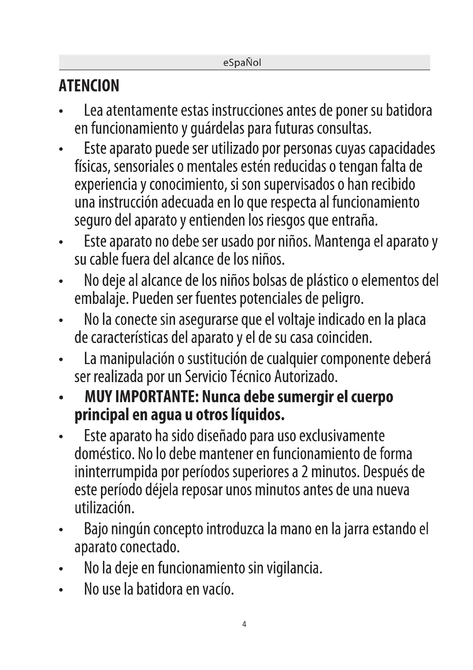 - MUY IMPORTANTE: Nunca debe sumergir el cuerpo principal en agua u otros líquidos.