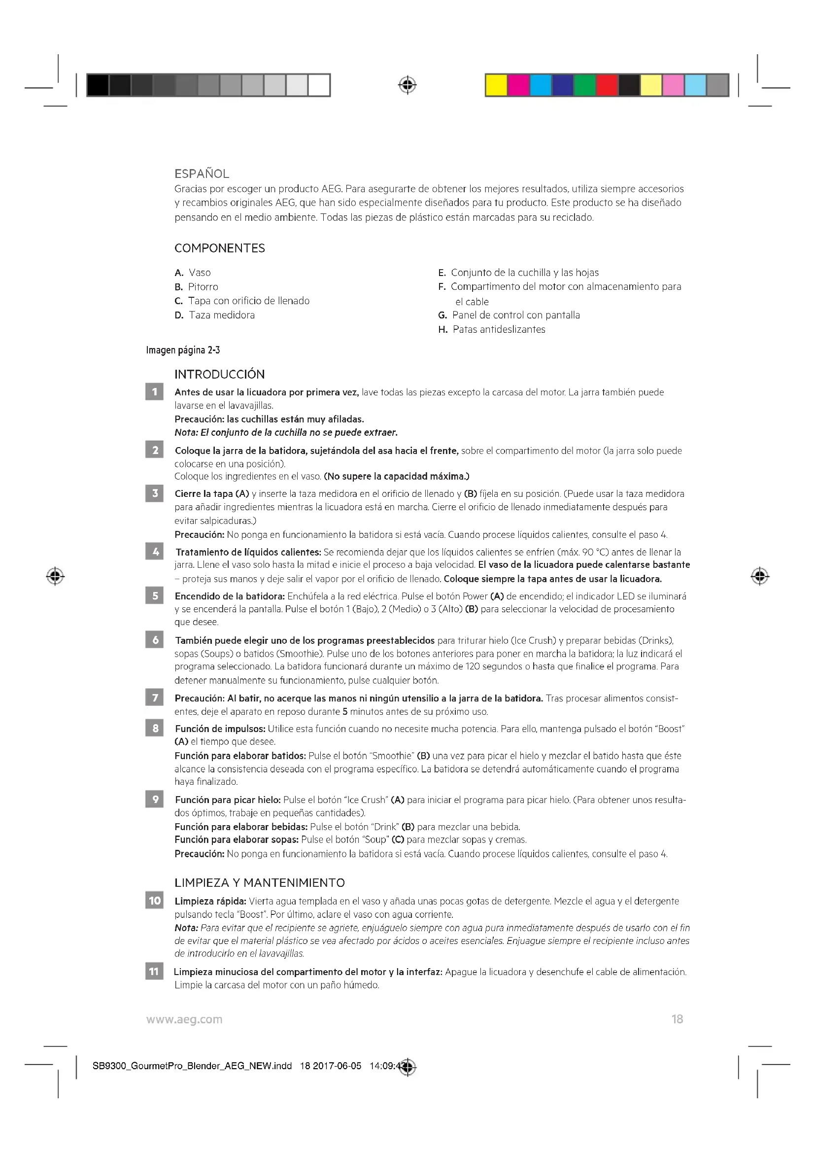 AEG SB9300_GourmetPro_Blender_AEG_NEW.indd 17 2017-06-05 14:09:4318 www.aeg.com ESPAÑOL Gracias por escoger un producto AEG. Para asegurarte de obtener los mejores resultados, utiliza siempre accesorios y recambios originales AEG, que han sido especialmente diseñados para tu producto. Este producto se ha diseñado pensando en el medio ambiente. Todas las piezas de plástico están marcadas para su reciclado. COMPONENTES A. Vaso B. Pitorro C. Tapa con oricio de llenado D. Taza medidora E. Conjunto de la cuchilla y las hojas F. Compartimento del motor con almacenamiento para el cable G. Panel de control con pantalla H. Patas antideslizantes Imagen página 2-3 INTRODUCCIÓN 1 Antes de usar la licuadora por primera vez, lave todas las piezas excepto la carcasa del motor. La jarra también puede lavarse en el lavavajillas. Precaución: las cuchillas están muy aladas. Nota: El conjunto de la cuchilla no se puede extraer. 2 Coloque la jarra de la batidora, sujetándola del asa hacia el frente, sobre el compartimento del motor (la jarra solo puede colocarse en una posición). Coloque los ingredientes en el vaso. (No supere la capacidad máxima.) 3 Cierre la tapa (A) y inserte la taza medidora en el oricio de llenado y (B) fíjela en su posición. (Puede usar la taza medidora para añadir ingredientes mientras la licuadora está en marcha. Cierre el oricio de llenado inmediatamente después para evitar salpicaduras.) Precaución: No ponga en funcionamiento la batidora si está vacía. Cuando procese líquidos calientes, consulte el paso 4. 4 Tratamiento de líquidos calientes: Se recomienda dejar que los líquidos calientes se enfríen (máx. 90 °C) antes de llenar la jarra. Llene el vaso solo hasta la mitad e inicie el proceso a baja velocidad. El vaso de la licuadora puede calentarse bastante – proteja sus manos y deje salir el vapor por el oricio de llenado. Coloque siempre la tapa antes de usar la licuadora. 5 Encendido de la batidora: Enchúfela a la red eléctrica. Pulse el botón Power (A) de encendido; el indicador LED se iluminará y se encenderá la pantalla. Pulse el botón 1 (Bajo), 2 (Medio) o 3 (Alto) (B) para seleccionar la velocidad de procesamiento que desee. 6 También puede elegir uno de los programas preestablecidos para triturar hielo (Ice Crush) y preparar bebidas (Drinks), sopas (Soups) o batidos (Smoothie). Pulse uno de los botones anteriores para poner en marcha la batidora; la luz indicará el programa seleccionado. La batidora funcionará durante un máximo de 120 segundos o hasta que nalice el programa. Para detener manualmente su funcionamiento, pulse cualquier botón. 7 Precaución: Al batir, no acerque las manos ni ningún utensilio a la jarra de la batidora. Tras procesar alimentos consist- entes, deje el aparato en reposo durante 5 minutos antes de su próximo uso. 8 Función de impulsos: Utilice esta función cuando no necesite mucha potencia. Para ello, mantenga pulsado el botón “Boost” (A) el tiempo que desee. Función para elaborar batidos: Pulse el botón “Smoothie” (B) una vez para picar el hielo y mezclar el batido hasta que éste alcance la consistencia deseada con el programa especíco. La batidora se detendrá automáticamente cuando el programa haya nalizado. 9 Función para picar hielo: Pulse el botón “Ice Crush” (A) para iniciar el programa para picar hielo. (Para obtener unos resulta- dos óptimos, trabaje en pequeñas cantidades). Función para elaborar bebidas: Pulse el botón “Drink” (B) para mezclar una bebida. Función para elaborar sopas: Pulse el botón “Soup” (C) para mezclar sopas y cremas. Precaución: No ponga en funcionamiento la batidora si está vacía. Cuando procese líquidos calientes, consulte el paso 4.