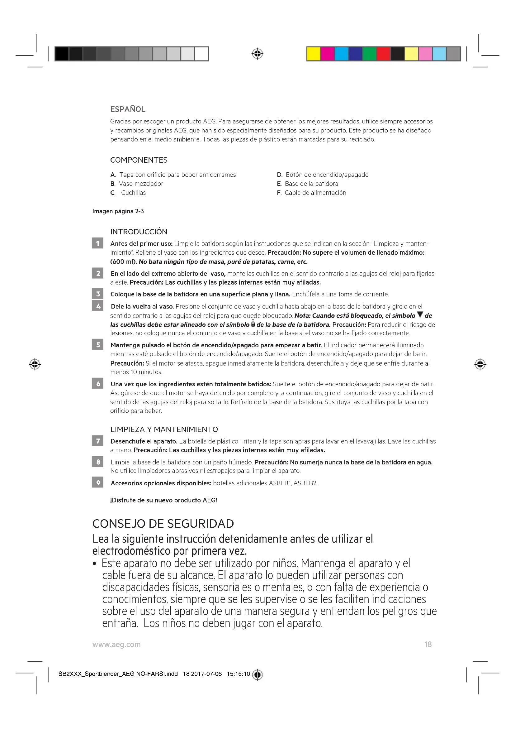 - Este electrodoméstico está diseñado únicamente para uso doméstico. El fabricante no puede aceptar responsabilidad alguna por los posibles daños causados por un uso inadecuado o incorrecto. SB2XXX_Sportblender_AEG NO-FARSI.indd 19 2017-07-06 15:16:1020 www.aeg.com