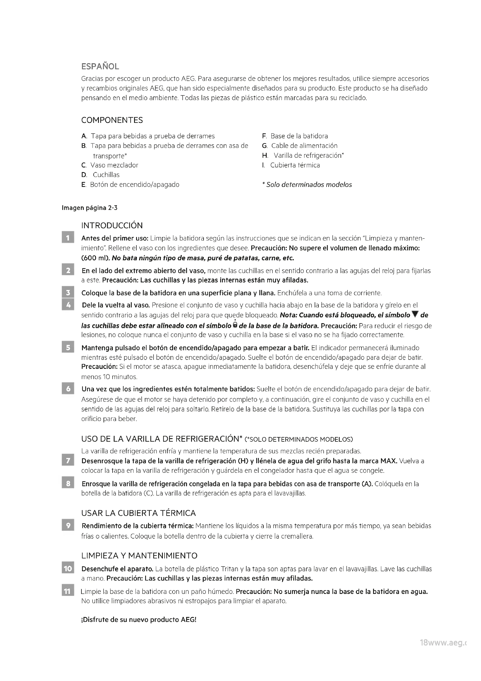 18www.aeg.com ESPAÑOL Gracias por escoger un producto AEG. Para asegurarse de obtener los mejores resultados, utilice siempre accesorios y recambios originales AEG, que han sido especialmente diseñados para su producto. Este producto se ha diseñado pensando en el medio ambiente. Todas las piezas de plástico están marcadas para su reciclado. COMPONENTES A. Tapa para bebidas a prueba de derrames B. Tapa para bebidas a prueba de derrames con asa de transporte* C. Vaso mezclador D. Cuchillas E. Botón de encendido/apagado F. Base de la batidora G. Cable de alimentación H. Varilla de refrigeración*