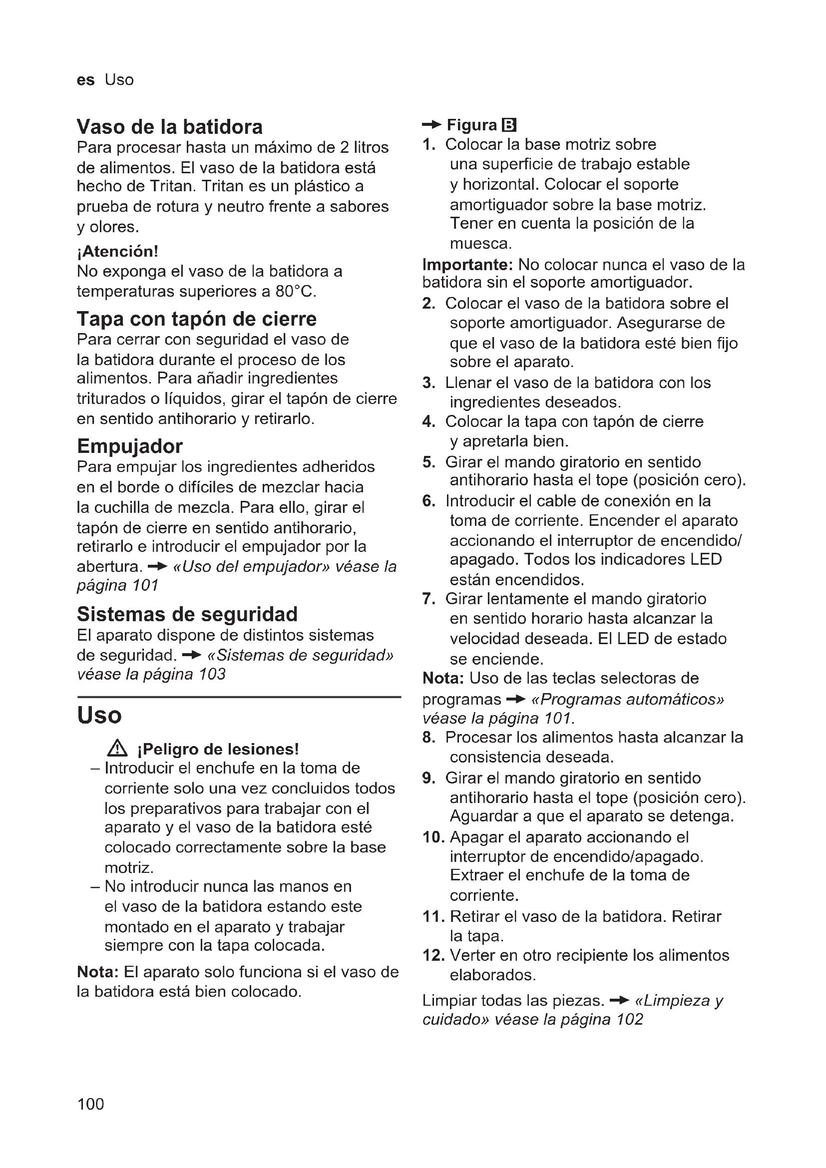 100 es Uso Vaso de la batidora Para procesar hasta un máximo de 2 litros de alimentos. El vaso de la batidora está hecho de Tritan. Tritan es un plástico a prueba de rotura y neutro frente a sabores y olores. ¡Atención! No exponga el vaso de la batidora a temperaturas superiores a 80°C. Tapa con tapón de cierre Para cerrar con seguridad el vaso de la batidora durante el proceso de los alimentos. Para añadir ingredientes triturados o líquidos, girar el tapón de cierre en sentido antihorario y retirarlo. Empujador Para empujar los ingredientes adheridos en el borde o difíciles de mezclar hacia la cuchilla de mezcla. Para ello, girar el tapón de cierre en sentido antihorario, retirarlo e introducir el empujador por la abertura. X «Uso del empujador» véase la página 101 Sistemas de seguridad El aparato dispone de distintos sistemas de seguridad. X «Sistemas de seguridad» véase la página 103 Uso W ¡Peligro de lesiones! – Introducir el enchufe en la toma de corriente solo una vez concluidos todos los preparativos para trabajar con el aparato y el vaso de la batidora esté colocado correctamente sobre la base motriz. – No introducir nunca las manos en el vaso de la batidora estando este montado en el aparato y trabajar siempre con la tapa colocada. Nota: El aparato solo funciona si el vaso de la batidora está bien colocado. X Figura B