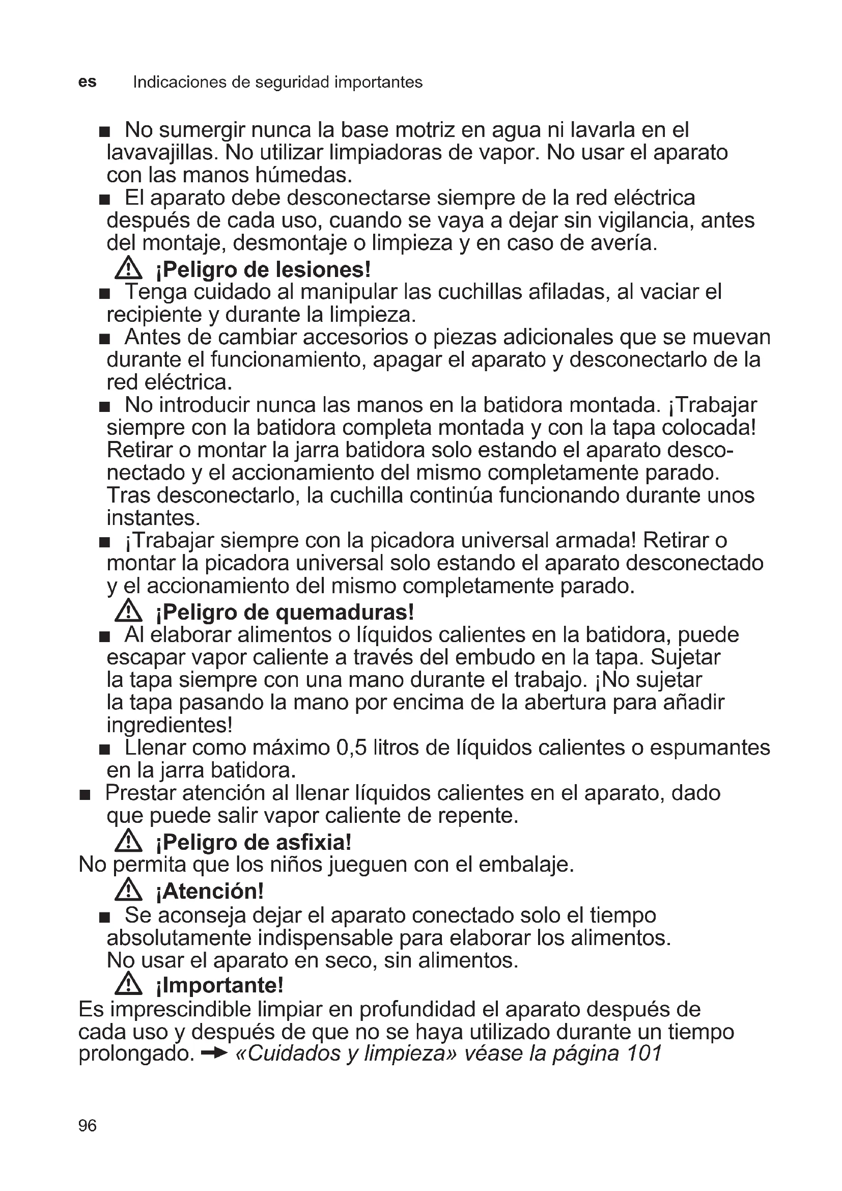 ■ No sumergir nunca la base motriz en agua ni lavarla en el lavavajillas. No utilizar limpiadoras de vapor. No usar el aparato con las manos húmedas. ■ El aparato debe desconectarse siempre de la red eléctrica después de cada uso, cuando se vaya a dejar sin vigilancia, antes del montaje, desmontaje o limpieza y en caso de avería. W ¡Peligro de lesiones! ■ Tenga cuidado al manipular las cuchillas aladas, al vaciar el recipiente y durante la limpieza. ■ Antes de cambiar accesorios o piezas adicionales que se muevan durante el funcionamiento, apagar el aparato y desconectarlo de la red eléctrica. ■ No introducir nunca las manos en la batidora montada. ¡Trabajar siempre con la batidora completa montada y con la tapa colocada! Retirar o montar la jarra batidora solo estando el aparato desco- nectado y el accionamiento del mismo completamente parado. Tras desconectarlo, la cuchilla continúa funcionando durante unos instantes. ■ ¡Trabajar siempre con la picadora universal armada! Retirar o montar la picadora universal solo estando el aparato desconectado y el accionamiento del mismo completamente parado. W ¡Peligro de quemaduras! ■ Al elaborar alimentos o líquidos calientes en la batidora, puede escapar vapor caliente a través del embudo en la tapa. Sujetar la tapa siempre con una mano durante el trabajo. ¡No sujetar la tapa pasando la mano por encima de la abertura para añadir ingredientes! ■ Llenar como máximo 0,5 litros de líquidos calientes o espumantes en la jarra batidora. ■ Prestar atención al llenar líquidos calientes en el aparato, dado que puede salir vapor caliente de repente. W ¡Peligro de asxia! No permita que los niños jueguen con el embalaje. W ¡Atención! ■ Se aconseja dejar el aparato conectado solo el tiempo absolutamente indispensable para elaborar los alimentos. No usar el aparato en seco, sin alimentos. W ¡Importante! Es imprescindible limpiar en profundidad el aparato después de cada uso y después de que no se haya utilizado durante un tiempo prolongado. X «Cuidados y limpieza» véase la página 10197 Contenido