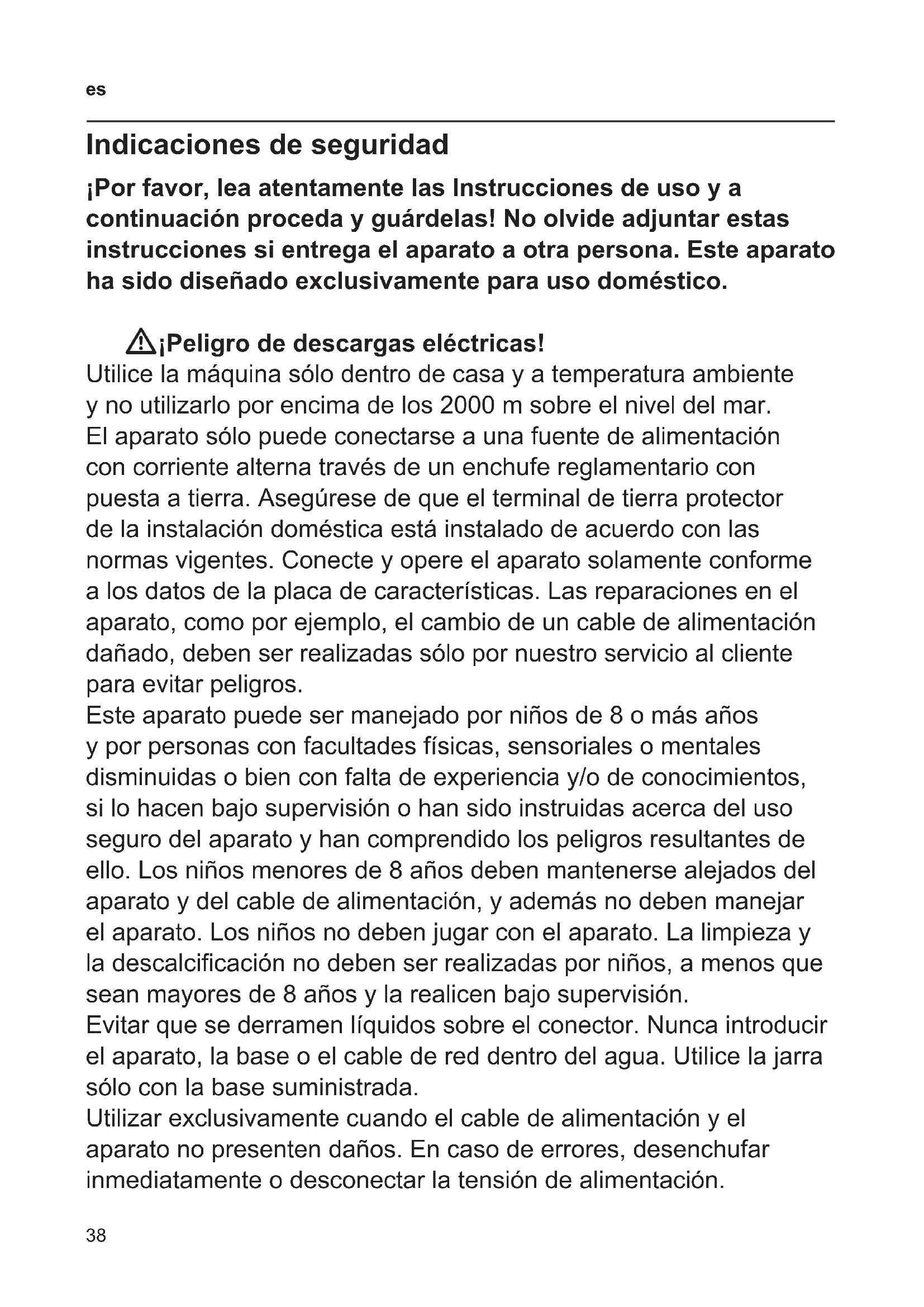 Indicaciones de seguridad ¡Por favor, lea atentamente las Instrucciones de uso y a continuación proceda y guárdelas! No olvide adjuntar estas instrucciones si entrega el aparato a otra persona. Este aparato ha sido diseñado exclusivamente para uso doméstico. W¡Peligro de descargas eléctricas! Utilice la máquina sólo dentro de casa y a temperatura ambiente y no utilizarlo por encima de los 2000 m sobre el nivel del mar. El aparato sólo puede conectarse a una fuente de alimentación con corriente alterna través de un enchufe reglamentario con puesta a tierra. Asegúrese de que el terminal de tierra protector de la instalación doméstica está instalado de acuerdo con las normas vigentes. Conecte y opere el aparato solamente conforme a los datos de la placa de características. Las reparaciones en el aparato, como por ejemplo, el cambio de un cable de alimentación dañado, deben ser realizadas sólo por nuestro servicio al cliente para evitar peligros. Este aparato puede ser manejado por niños de 8 o más años y por personas con facultades físicas, sensoriales o mentales disminuidas o bien con falta de experiencia y/o de conocimientos, si lo hacen bajo supervisión o han sido instruidas acerca del uso seguro del aparato y han comprendido los peligros resultantes de ello. Los niños menores de 8 años deben mantenerse alejados del aparato y del cable de alimentación, y además no deben manejar el aparato. Los niños no deben jugar con el aparato. La limpieza y la descalcicación no deben ser realizadas por niños, a menos que sean mayores de 8 años y la realicen bajo supervisión. Evitar que se derramen líquidos sobre el conector. Nunca introducir el aparato, la base o el cable de red dentro del agua. Utilice la jarra sólo con la base suministrada. Utilizar exclusivamente cuando el cable de alimentación y el aparato no presenten daños. En caso de errores, desenchufar inmediatamente o desconectar la tensión de alimentación.39