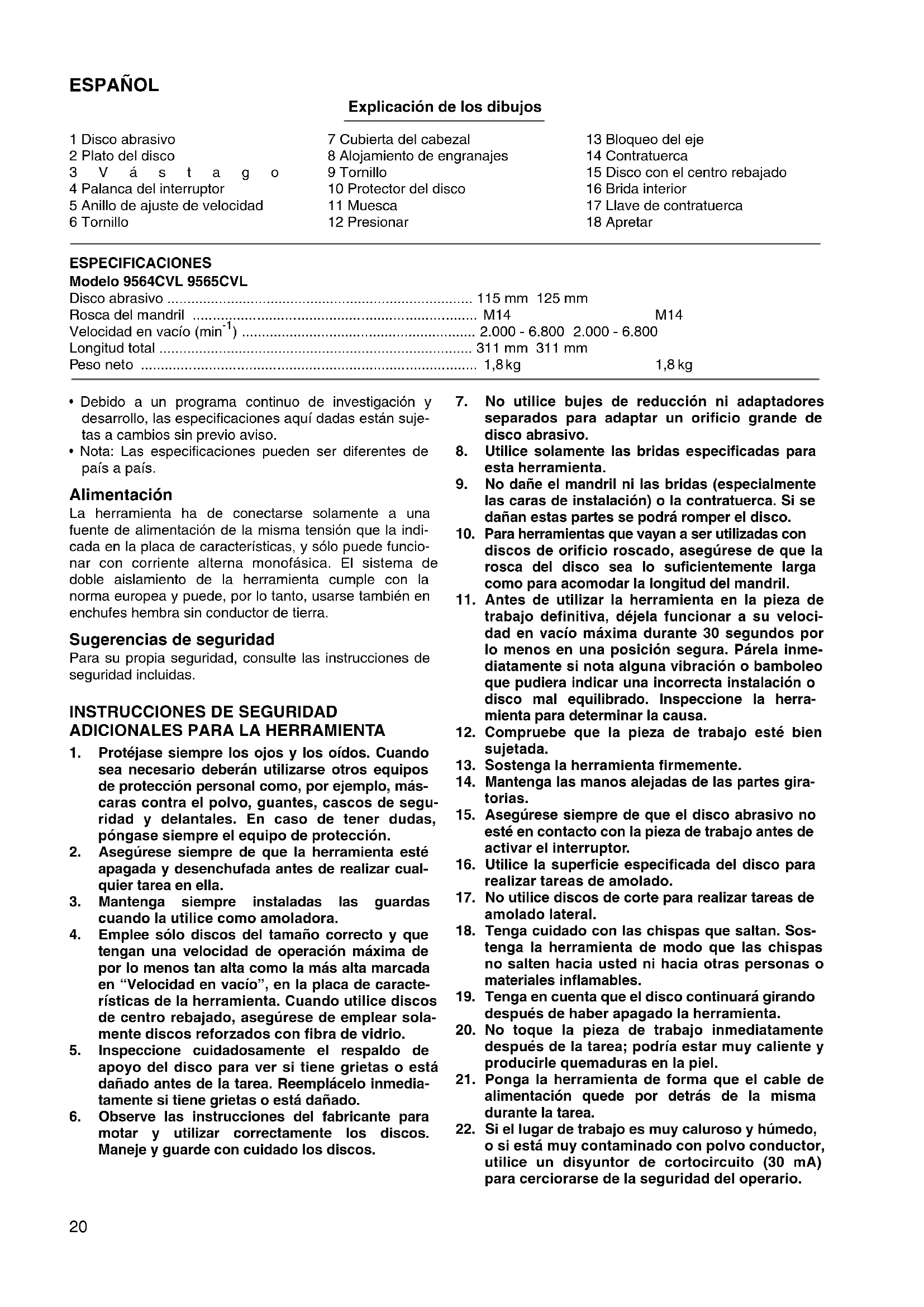 tengan una velocidad de operación máxima de por lo menos tan alta como la más alta marcada en “Velocidad en vacío”, en la placa de caracte- rísticas de la herramienta. Cuando utilice discos de centro rebajado, asegúrese de emplear sola- mente discos reforzados con fibra de vidrio.