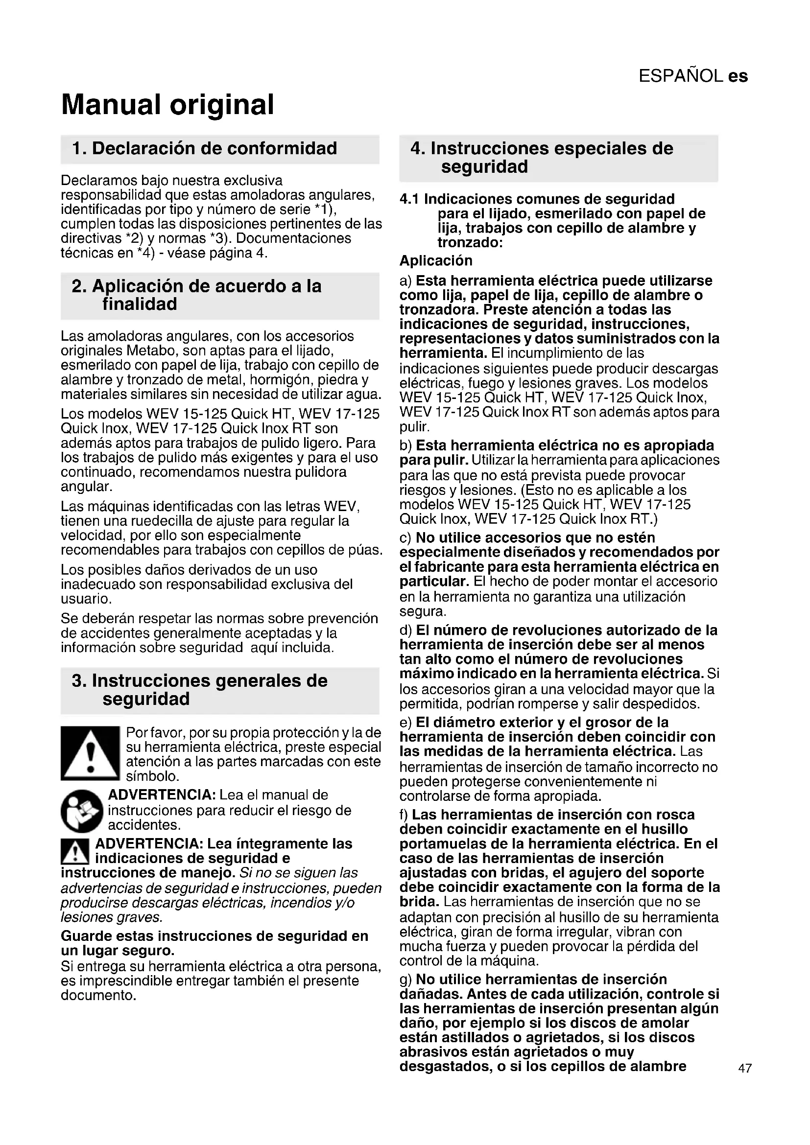 Manual original Declaramos bajo nuestra exclusiva responsabilidad que estas amoladoras angulares, identificadas por tipo y número de serie *1), cumplen todas las disposiciones pertinentes de las directivas *2) y normas *3). Documentaciones técnicas en *4) - véase página 4. Las amoladoras angulares, con los accesorios originales Metabo, son aptas para el lijado, esmerilado con papel de lija, trabajo con cepillo de alambre y tronzado de metal, hormigón, piedra y materiales similares sin necesidad de utilizar agua. Los modelos WEV 15-125 Quick HT, WEV 17-125 Quick Inox, WEV 17-125 Quick Inox RT son además aptos para trabajos de pulido ligero. Para los trabajos de pulido más exigentes y para el uso continuado, recomendamos nuestra pulidora angular. Las máquinas identificadas con las letras WEV, tienen una ruedecilla de ajuste para regular la velocidad, por ello son especialmente recomendables para trabajos con cepillos de púas. Los posibles daños derivados de un uso inadecuado son responsabilidad exclusiva del usuario. Se deberán respetar las normas sobre prevención de accidentes generalmente aceptadas y la información sobre seguridad aquí incluida. Por favor, por su propia protección y la de su herramienta eléctrica, preste especial atención a las partes marcadas con este símbolo. ADVERTENCIA: Lea el manual de instrucciones para reducir el riesgo de accidentes. ADVERTENCIA: Lea íntegramente las indicaciones de seguridad e instrucciones de manejo. Si no se siguen las advertencias de seguridad e instrucciones, pueden producirse descargas eléctricas, incendios y/o lesiones graves. Guarde estas instrucciones de seguridad en un lugar seguro. Si entrega su herramienta eléctrica a otra persona, es imprescindible entregar también el presente documento.