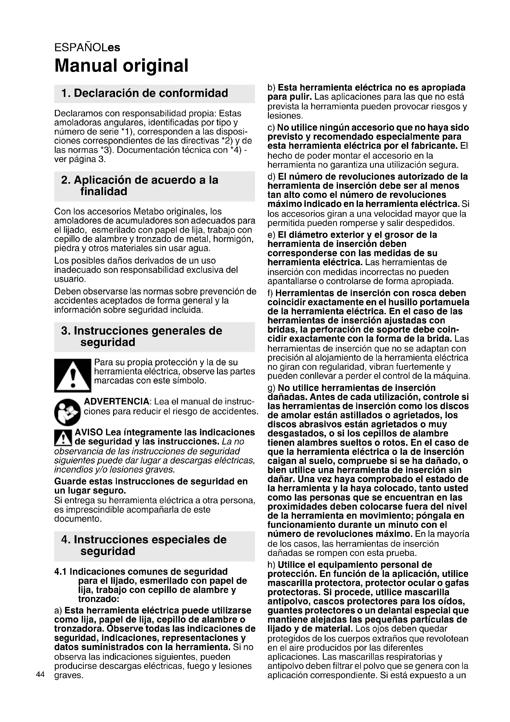 Manual original Declaramos con responsabilidad propia: Estas amoladoras angulares, identificadas por tipo y número de serie *1), corresponden a las disposi- ciones correspondientes de las directivas *2) y de las normas *3). Documentación técnica con *4) - ver página 3. Con los accesorios Metabo originales, los amoladores de acumuladores son adecuados para el lijado, esmerilado con papel de lija, trabajo con cepillo de alambre y tronzado de metal, hormigón, piedra y otros materiales sin usar agua. Los posibles daños derivados de un uso inadecuado son responsabilidad exclusiva del usuario. Deben observarse las normas sobre prevención de accidentes aceptados de forma general y la información sobre seguridad incluida. Para su propia protección y la de su herramienta eléctrica, observe las partes marcadas con este símbolo. ADVERTENCIA: Lea el manual de instruc- ciones para reducir el riesgo de accidentes. AVISO Lea íntegramente las indicaciones de seguridad y las instrucciones. La no observancia de las instrucciones de seguridad siguientes puede dar lugar a descargas eléctricas, incendios y/o lesiones graves. Guarde estas instrucciones de seguridad en un lugar seguro. Si entrega su herramienta eléctrica a otra persona, es imprescindible acompañarla de este documento.
