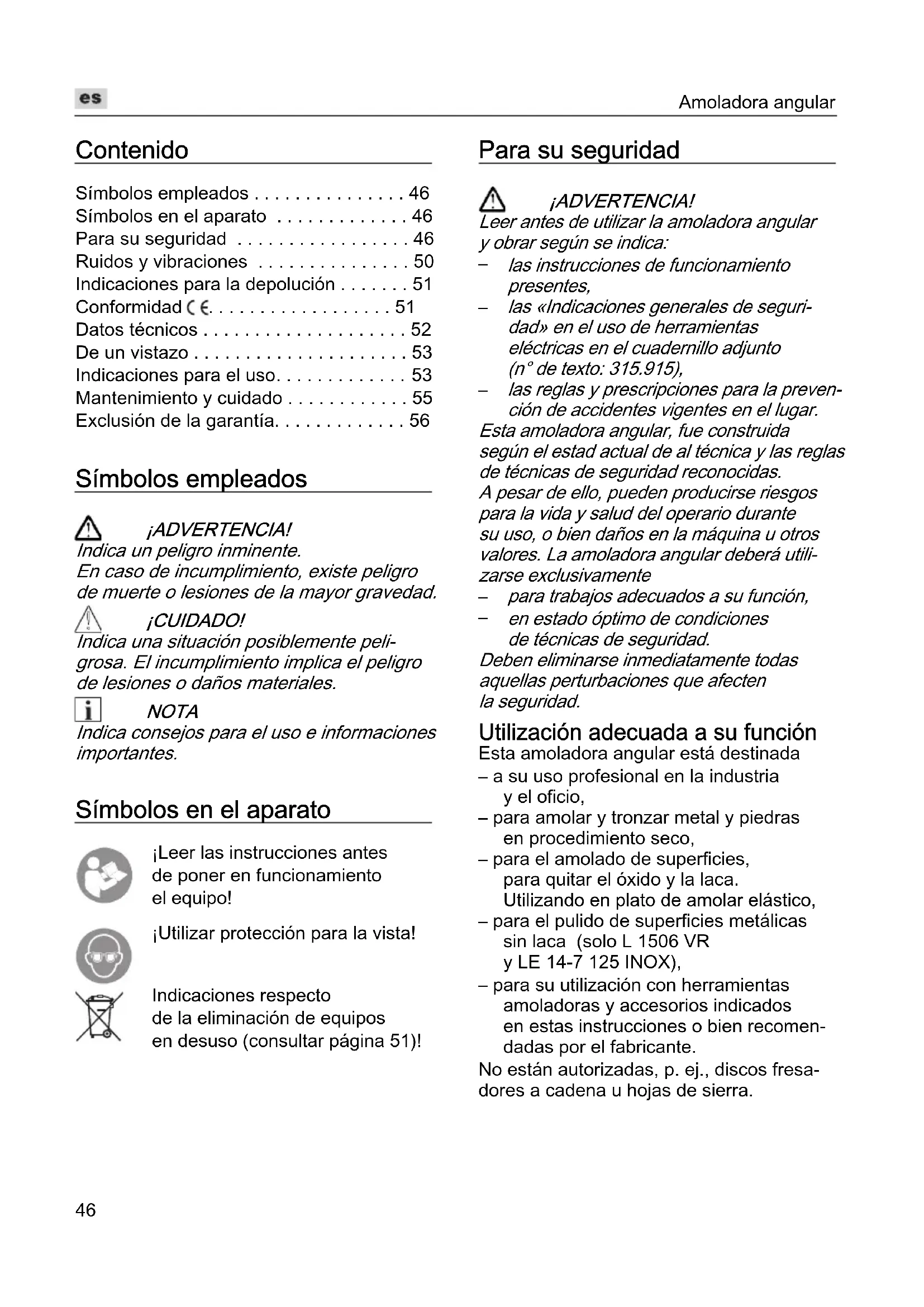 - Exclusión de la garantía Símbolos empleados ¡ADVERTENCIA! Indica un peligro inminente. En caso de incumplimiento, existe peligro de muerte o lesiones de la mayor gravedad. ¡CUIDADO! Indica una situación posiblemente peli- grosa. El incumplimiento implica el peligro de lesiones o daños materiales. NOTA Indica consejos para el uso e informaciones importantes. Símbolos en el aparato ¡Leer las instrucciones antes de poner en funcionamiento el equipo! ¡Utilizar protección para la vista! Indicaciones respecto de la eliminación de equipos en desuso (consultar página 51)! Para su seguridad ¡ADVERTENCIA! Leer antes de utilizar la amoladora angular y obrar según se indica: p. 56